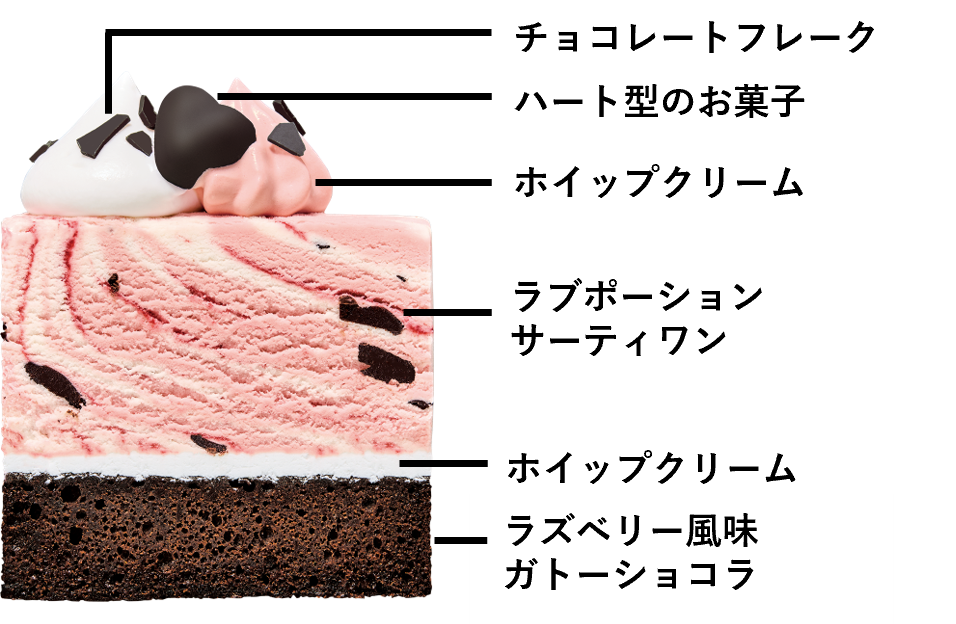 サーティワンの大人気フレーバー「ラブポーションサーティワン」が、遂に本シリーズに登場。ラズベリーとホワイトチョコレートのフレーバーに、専用に開発したラズベリーが香るガトーショコラを合わせ、アイスクリームとケーキが一緒に味わえる本格的なケーキに仕上がっています。トッピングにはフレーバーに使用しているハート型菓子やチョコレートフレーク、さらに「31 PÂTISSERIE」のロゴ入りチョコプレートをのせ、見た目の華やかさにもこだわっています。サーティワンだけの特別な美味しさが楽しめます。