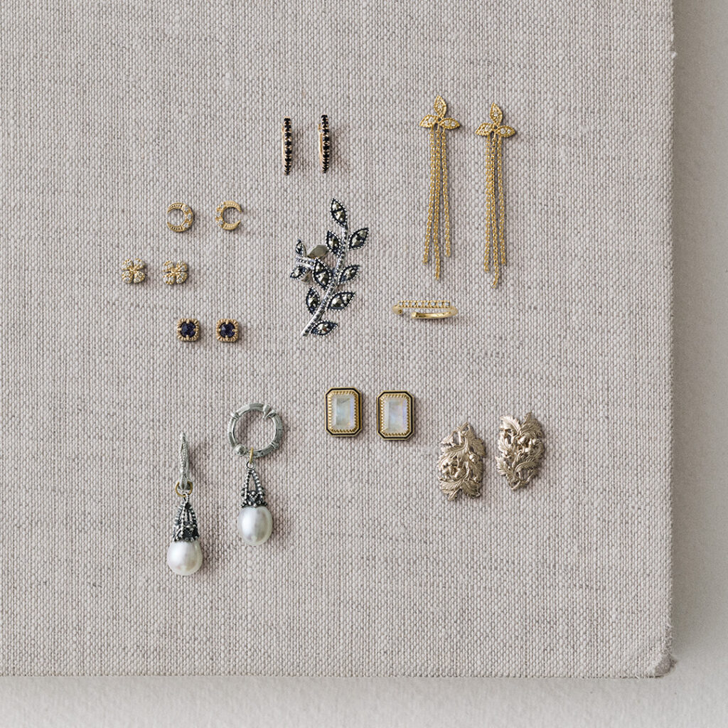 植物や月などをモチーフにしたピアス、イヤーカフが、デザインバリエーション豊かにラインナップ。お守りの様に身に着けたり、異なるサイズ感のものをレイヤードしたり、洋服を着替えるようにコーディネートが楽しめます。シルキーな質感のフープピアスは、主張しすぎず大人の抜け感を演出できます。