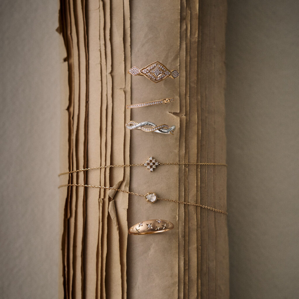 ボリュームのあるシルバーと、繊細なゴールドのコントラストがミニマルな印象のリングとブレスレットは、世代や性別を超えてジュエリーを楽しんでもらいたいという同コレクションの想いが詰まったデザイン。ブレスレットのチェーンは重すぎず軽すぎず絶妙なボリューム感に仕上げた。バケットダイヤモンドがスタイリッシュなシリーズは、マットに反射する穏やかな光が日常使いにそっと馴染んでくれる。