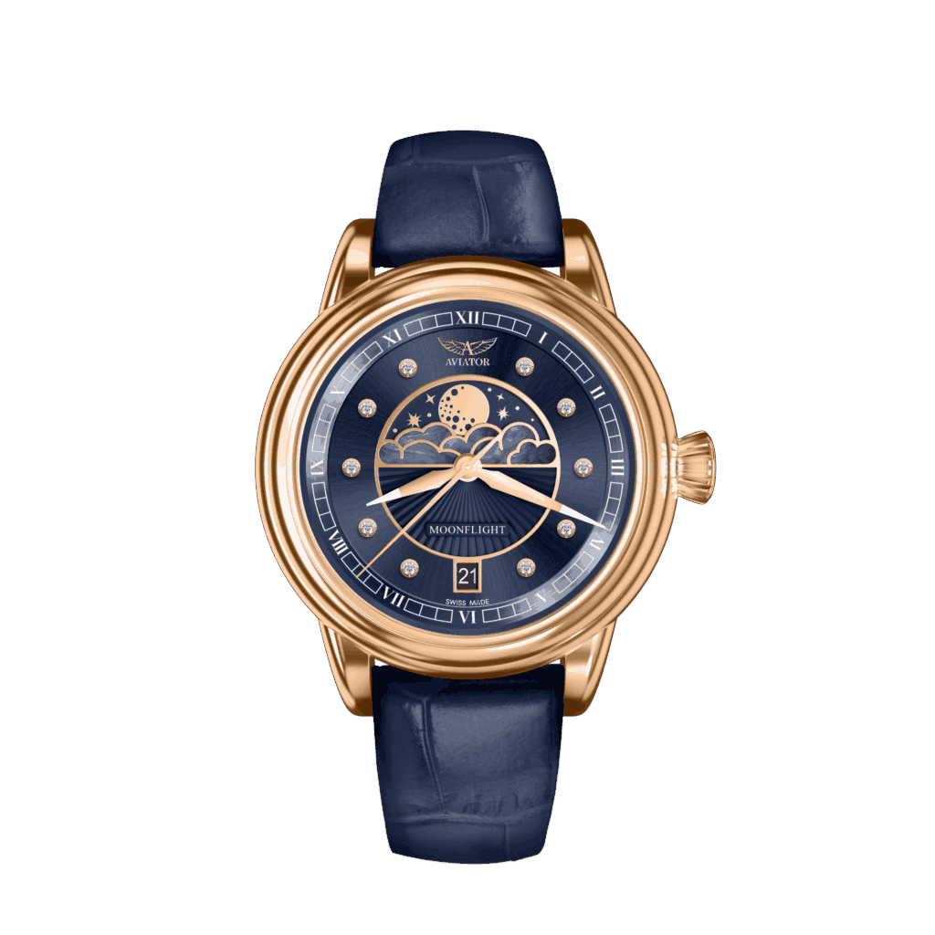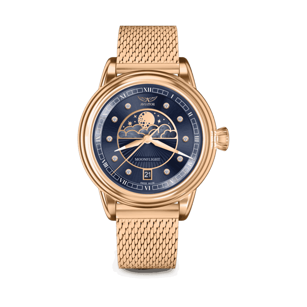 ケースバックには、月光に導かれ飛ぶダグラスDC-3がエングレービングで描かれています。異なる仕上げを重ねることで、光と陰が繊細に交差し、見る角度によってまるで飛行機が夜空を進むような立体感を演出。女性らしさと冒険心、その両方を兼ね備えたAVIATORの哲学を象徴しています。