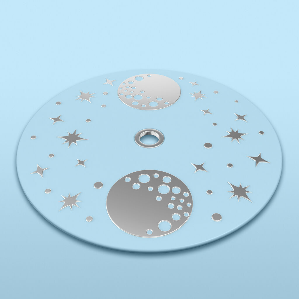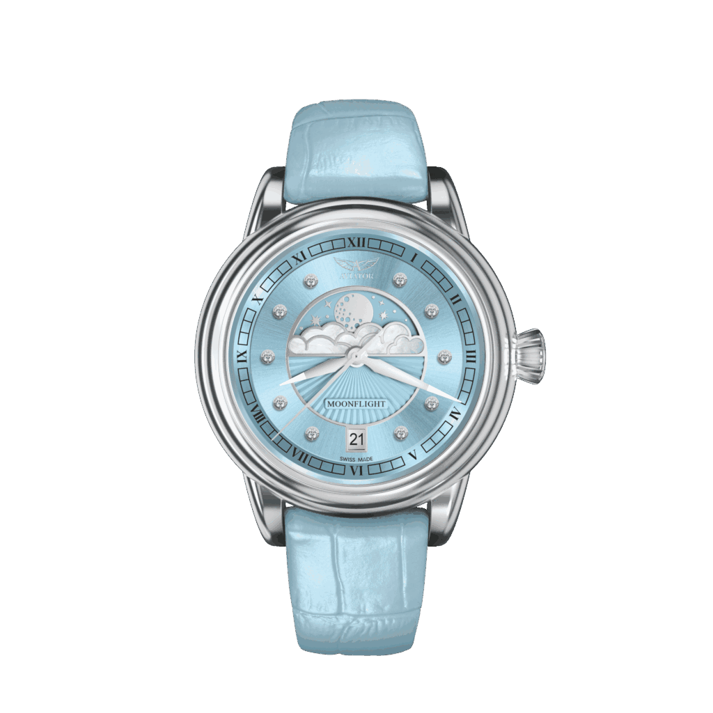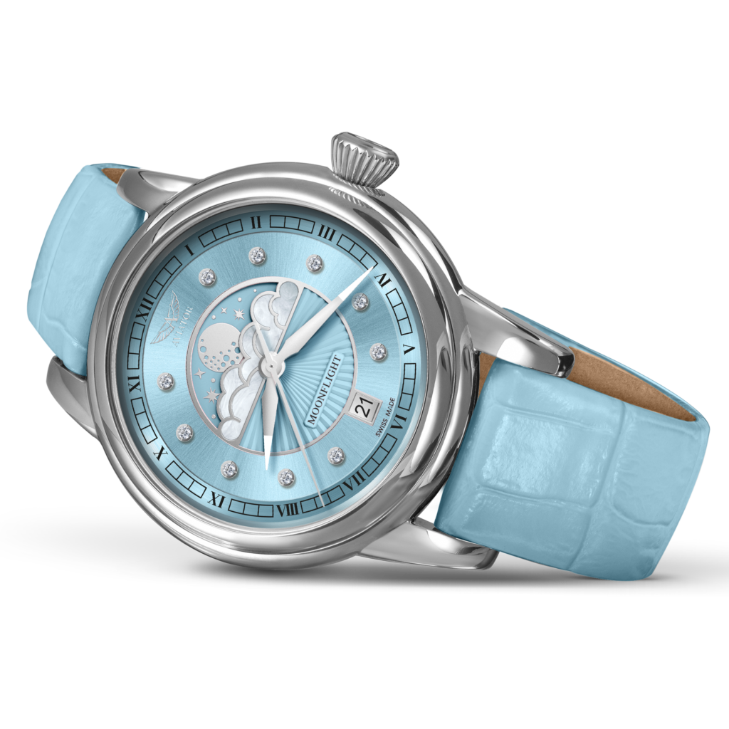 月の光が夜空を彩るように、ムーンフライトのダイヤルはスカイブルーやグレイッシュトーンなど空と時間の移ろいを映し出す多彩なカラーパレットで展開。特に“Sky Blue”は、夜明け前の一瞬の魔法のような色を再現しています。