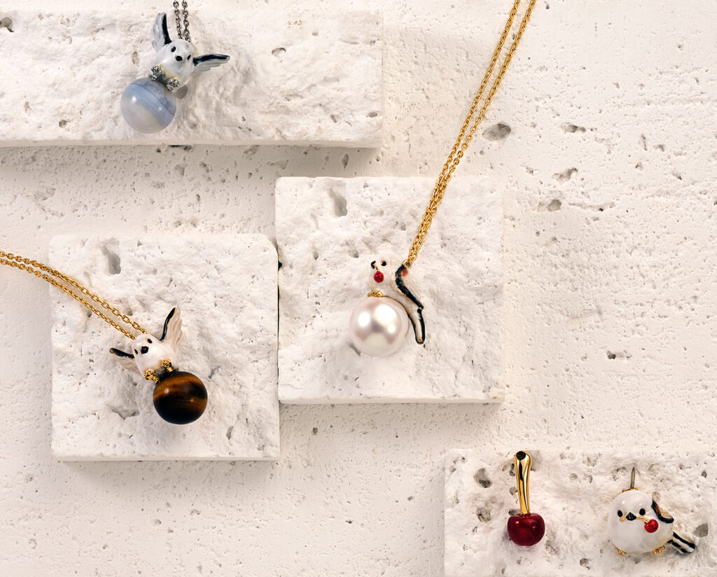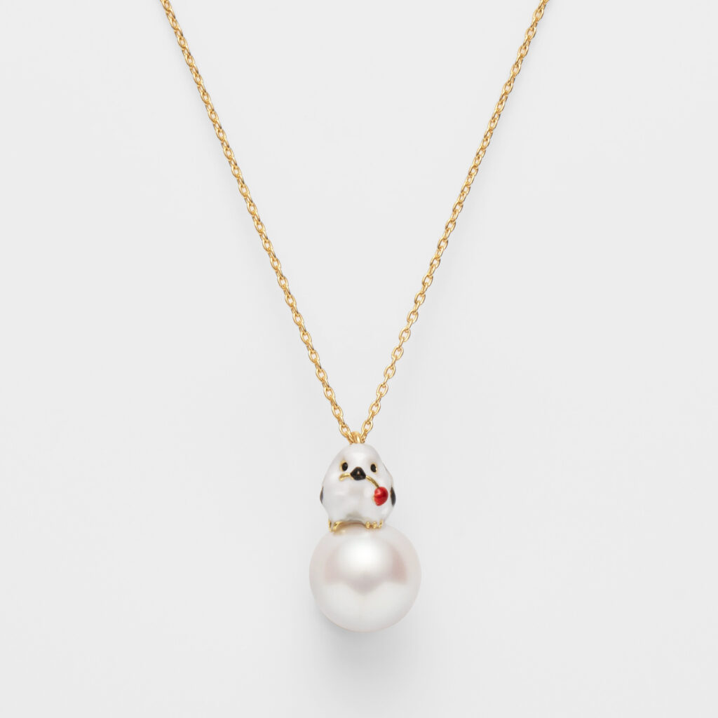 ふわふわの真っ白い羽毛にまん丸シルエットが愛らしいシマエナガのネックレス。赤い実をくわえたシマエナガが、冬の訪れを告げます。雪に見立てたパールは、廃材をアップサイクルした「再生プラスティックパール」を使用しています。