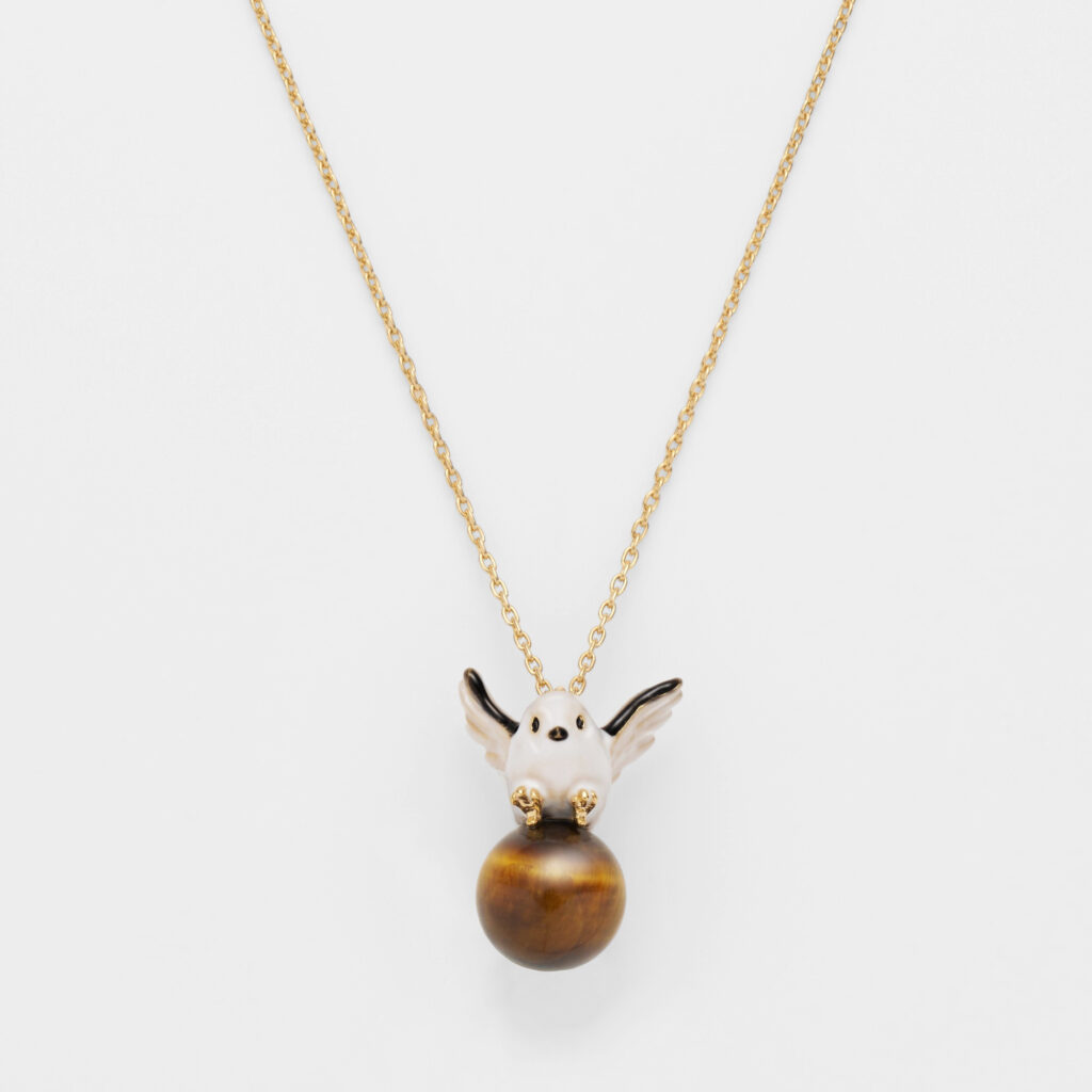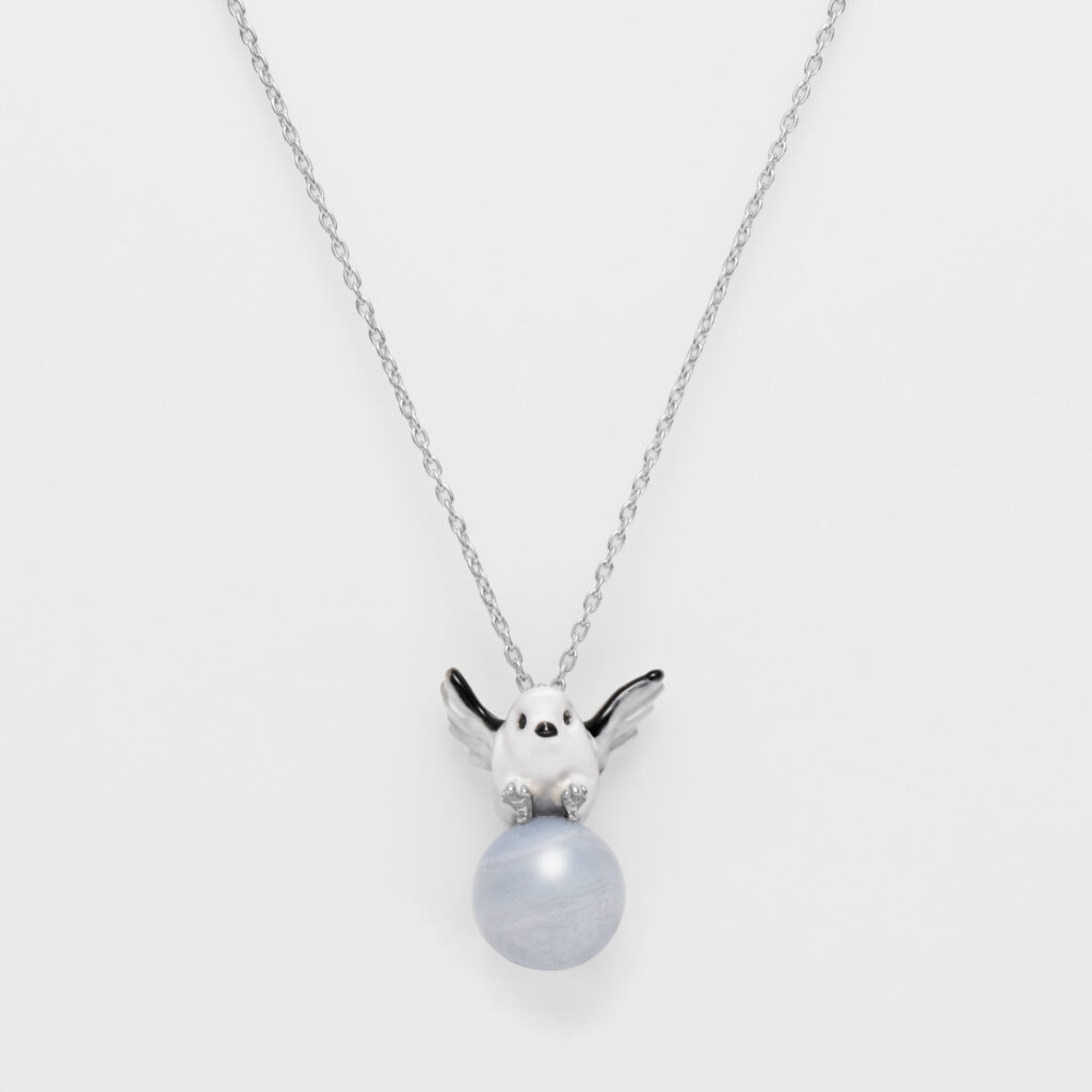 木の枝から颯爽と飛び立つ1羽のシマエナガ。冬の森の中で暮らす、シマエナガの一瞬の動きをネックレスに。ブルーレースアゲートは優しい空色を持つことから「深い癒し」の力があると言われています。木に見立てたタイガーアイには「金運」や「仕事運」アップの石言葉があります。 胸元の愛らしいシマエナガが、心に癒しと幸運を運んで来ます。