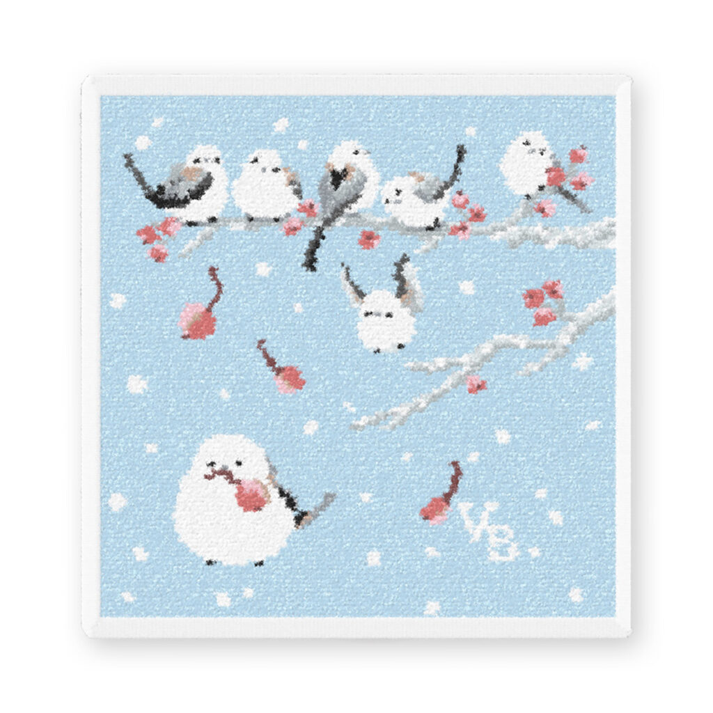 ハンカチはシマエナガが木の枝に集まり仲良く並んでいる様子を描いたオリジナルデザイン。