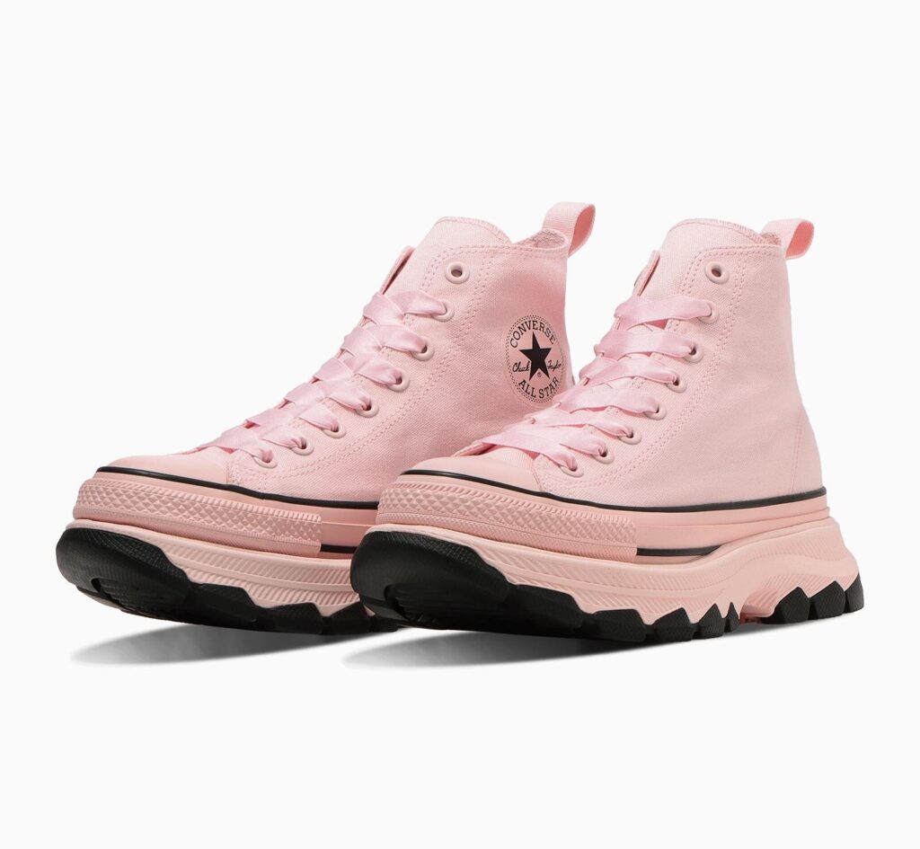 ブラック&ピンクのコントラストが目を引く「オールスター トレックウエーブ BP HI」は、ガーリーなムードとエッジを併せ持ったウィメンズ厚底スニーカー。トレッキングシューズ由来のボリューミーなアウトソールに、甘さのある配色と艶やかなコットンサテンのシューレースを合わせた”ギャップ”のあるデザインに仕上がっています。存在感がありつつ軽量で、履き心地にもこだわっています。