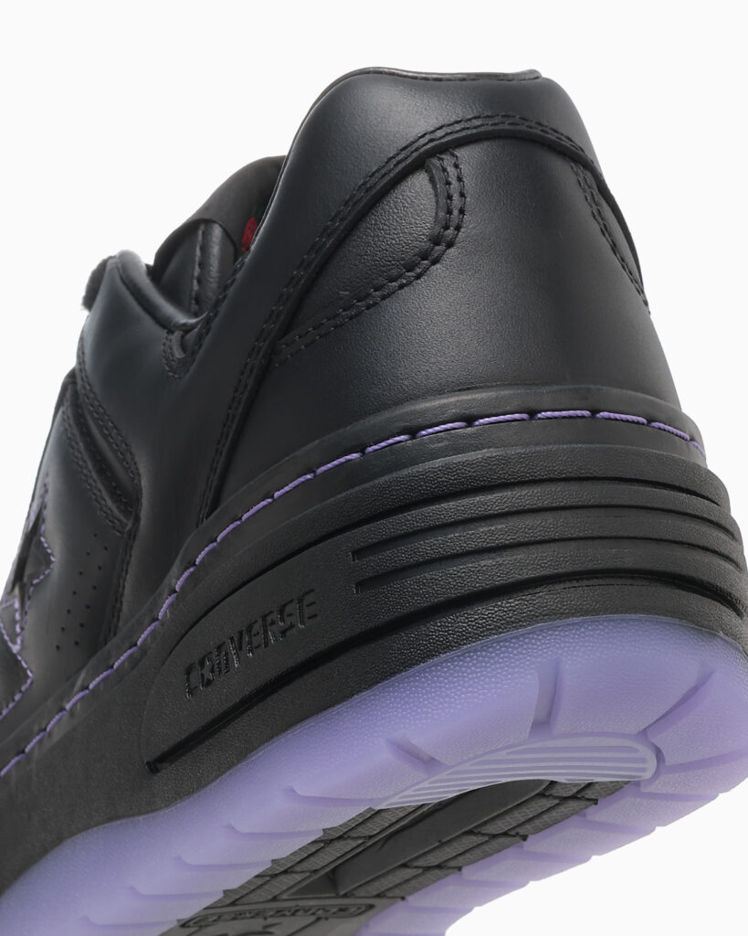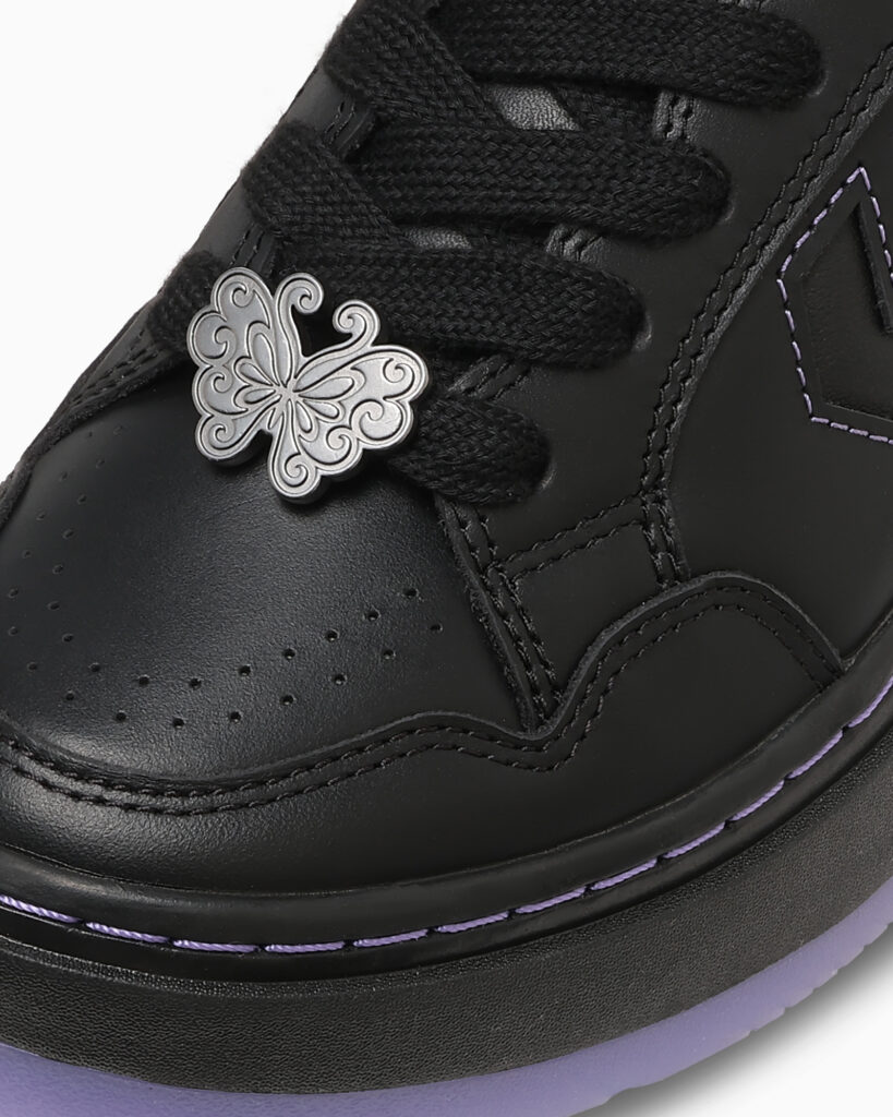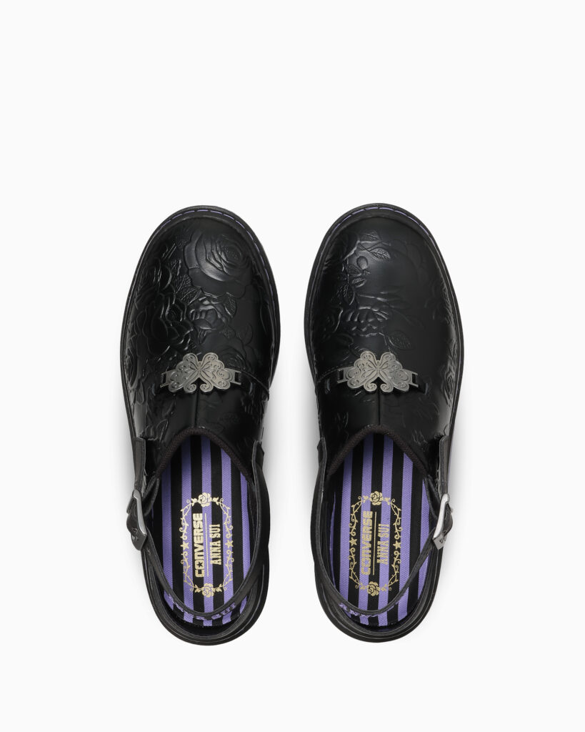 また、「WEAPON PLTS CLG OX / ANNA SUI」は、同モデルをクロッグ仕様にアレンジしています。ANNA SUIのイメージカラーでもあるブラック/パープルのカラーリングでまとめ、ブランドのアイコンである蝶や薔薇のモチーフを取り入れました。インソールにはANNA SUIカラーのストライプ柄にダブルネームプリントを施しています。オリジナルのカートン入りです。また、アウトソールにはE.V.A.とラバーを組み合わせることで厚底ながら軽量化を実現しています。