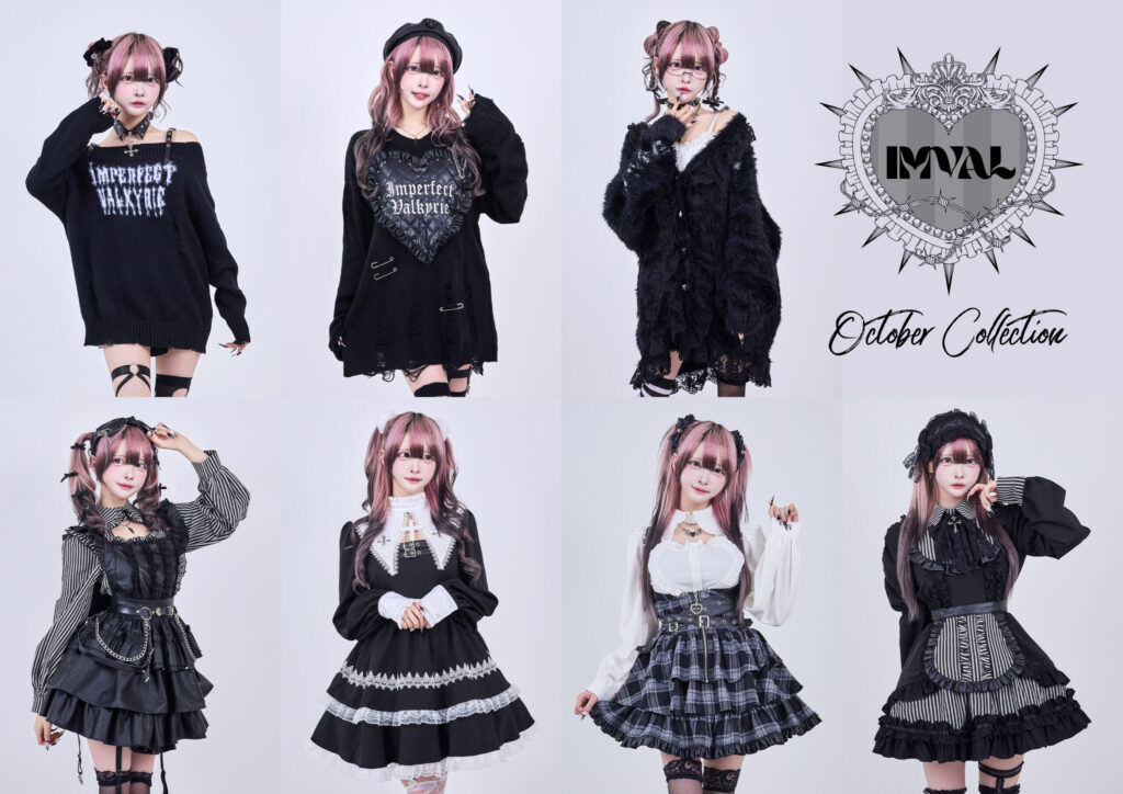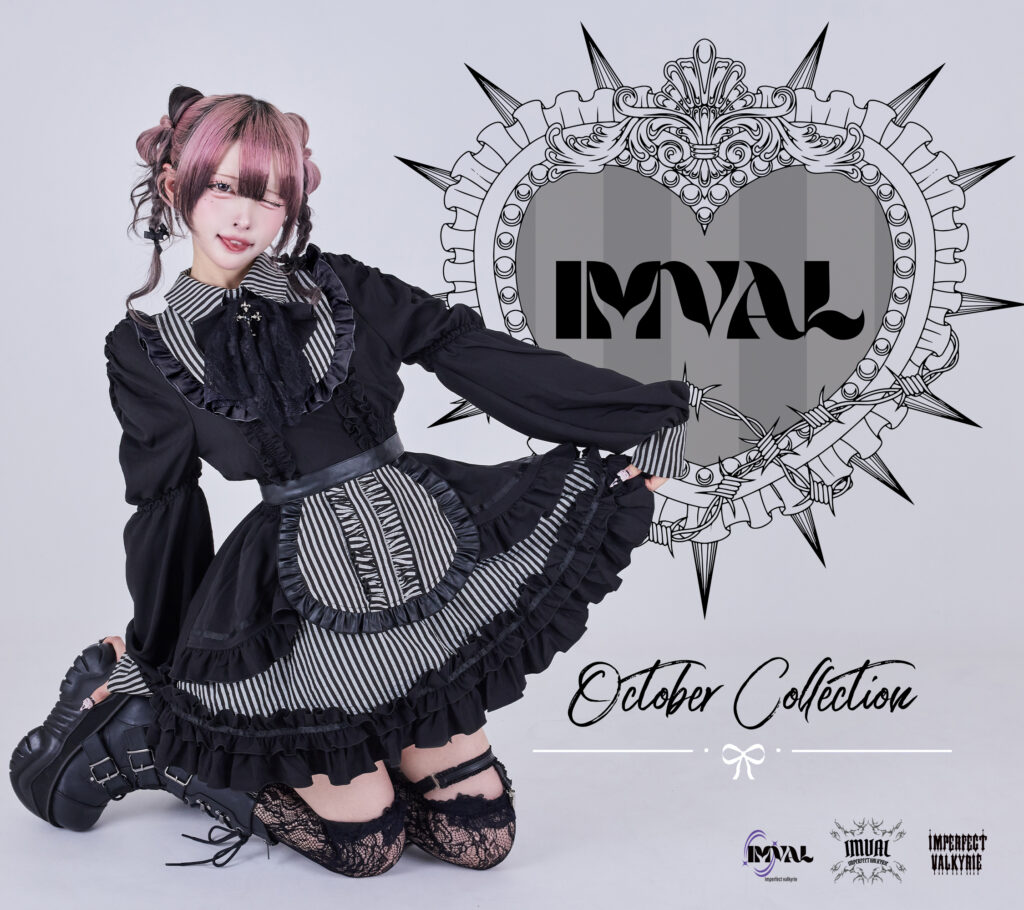 新作は、メイド、シスター、そしてゴシックを掛け合わせたドレス群から、ざっくりと羽織れるシャギーカーディガンや、退廃を纏ったダメージニットまで。大人気のHeart Shirtには、新色“ストライプ”、Frill Leather Dressからは、“グレーチェック”が登場。甘美さと暴力性が交差する“IMVALらしさ”をさらに鋭く表現した全8アイテムが揃います。