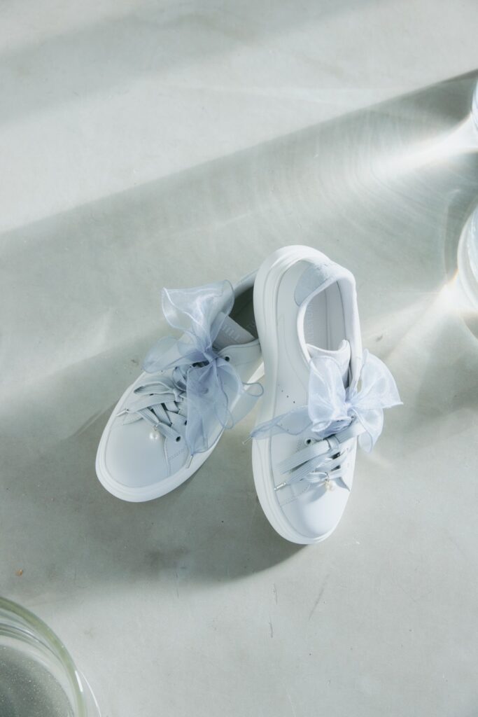 カジュアルな中に、さりげない女性らしさを感じるスニーカー。スムース素材をベースに、スエードやエナメルを組み合わせたニュアンスカラーが大人フェミニンな一足です。取り外しのできるパールやロゴチャーム、表情の違う2種類のシューレースが付属。オーガンジーリボンが軽やかな女性らしさを演出します。4cmソールでさりげないスタイルアップも。