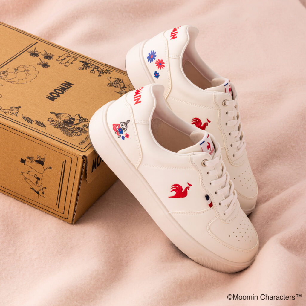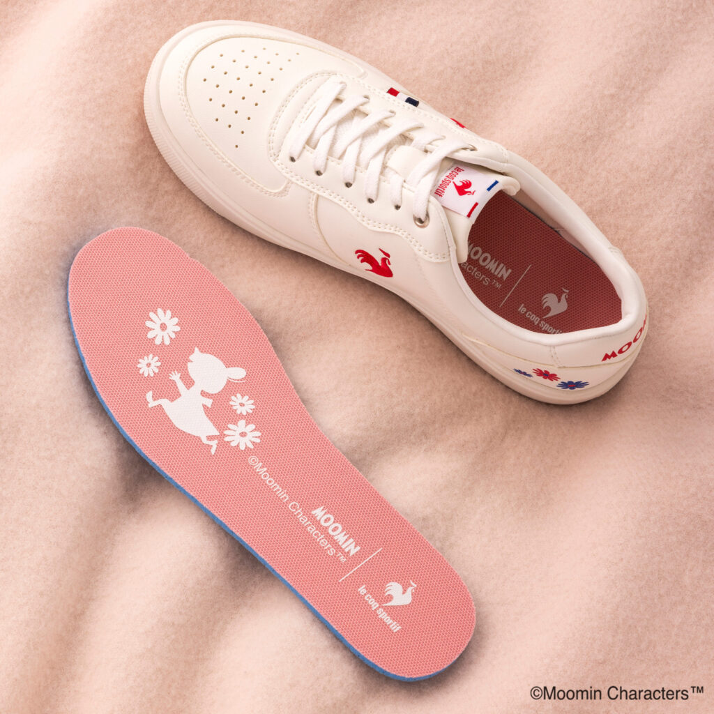 軽量性とボリューム感を両立させたアウトソールが特徴で、スタイルアップだけでなく履き心地にも配慮した設計の「ニーム」のコラボレーションモデルです。穏やかな風景の中で好奇心いっぱいに駆け回るリトルミイをデザインテーマに、そのエネルギッシュな魅力を赤と青と白のトリコロールカラーで表現しました。かかとに花と戯れるリトルミイを、インソールには駆け回るリトルミイのシルエットをあしらっています。