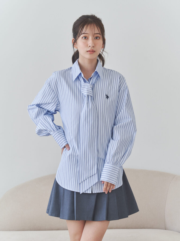 首元に大きなリボンタイをあしらったクラシカルなデザインで、オーバーサイズ気味のシルエットがゆったりとした抜け感をプラスします。胸元のU.S. POLO ASSN.のポイント刺繍がアクセントに。プレーンなホワイトはフォーマルにもカジュアルにも着回しやすい万能デザインです。爽やかなストライプ柄のアイスブルーは知的でスクールライクなスタイリング。オリジナルの格子模様を使用したミックスはよりクラシカルな雰囲気をお楽しみいただけます。