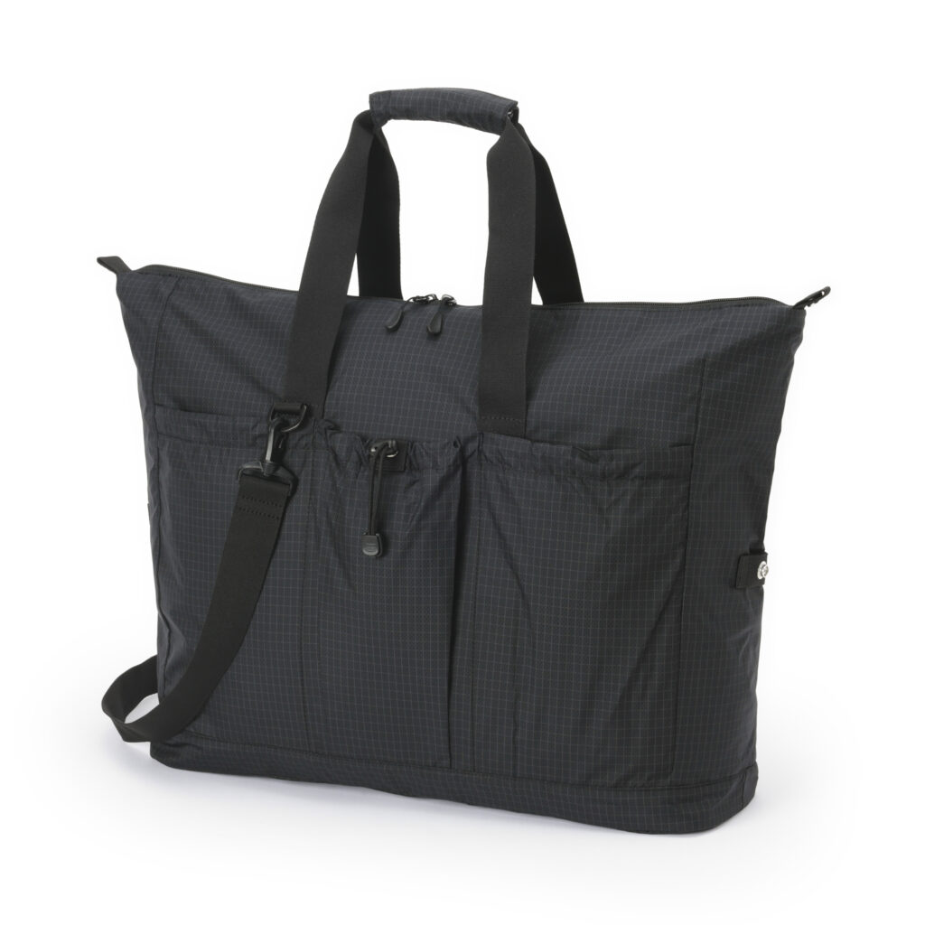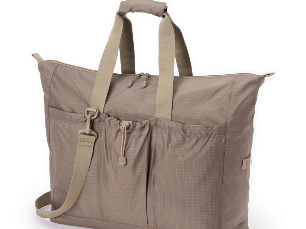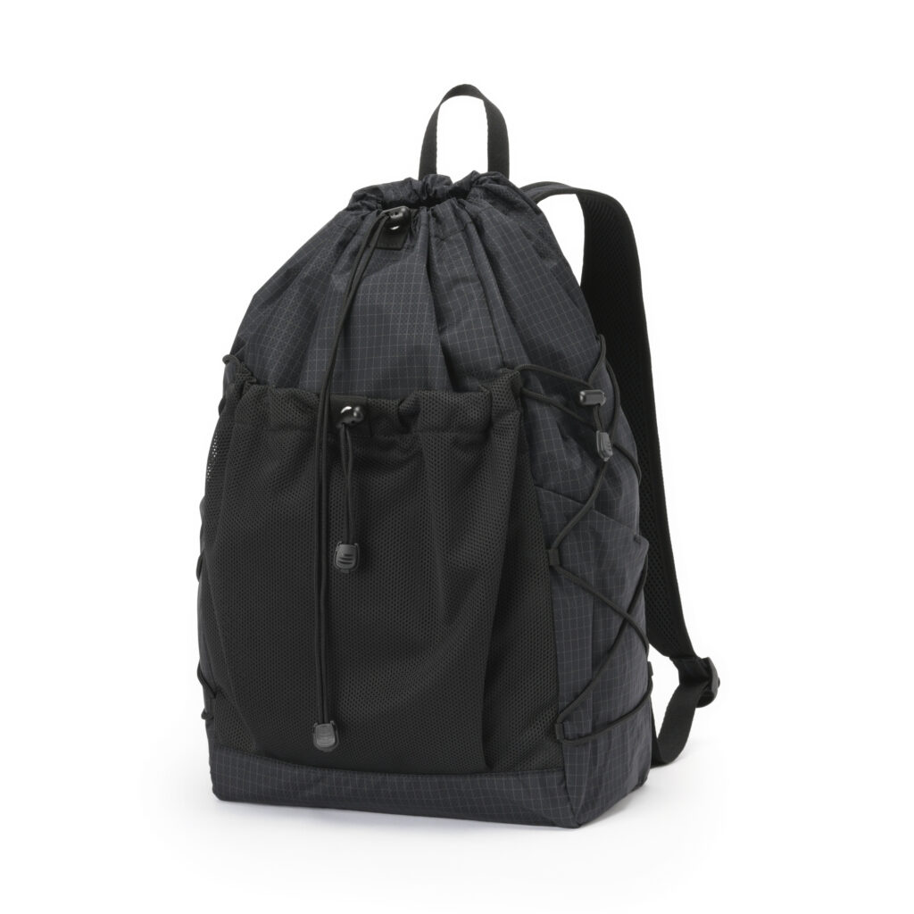 ナイロン地に強度の高いポリエステルの糸を格子状に織り込んだリップストップ生地は、パラシュートやテント、寝袋などアウトドア用品に活用される素材です。軽くて丈夫なので、普段使いはもちろん、春夏のレジャーシーンやジム通い用のバッグとしても使用できます。また、生地には再生素材を100%使用し、一部に撥水加工を施しています。