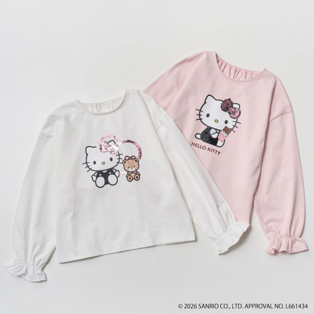 カラーでデザインが変わるアソート仕様。フロントには「ハローキティ」のプリントと大好評の色の変わるスパンコール刺繍をデザイン。たぷんとした袖が可愛いロングスリーブTシャツで、バックネックはゴム仕様で着脱しやすくなっています。