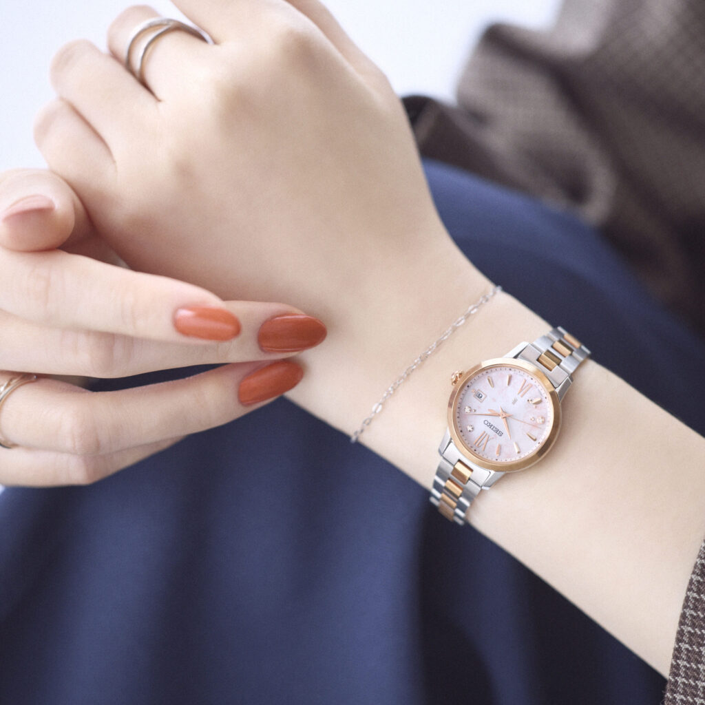 「セイコー ルキア」は、1995年、女性の腕時計が主にアクセサリーとしてとらえられていた時代に、自分らしく生きるための実用ウオッチのパイオニアとして誕生しました。上質な輝きと確かな品質で、日々のスタイルをクラスアップするレディスウオッチブランドです。トノー形のSSWA018と丸形のSSVW244丸形のSSVW244は、白蝶貝のダイヤルに柔らかなピンクのグラデーションを重ね、咲き誇る八重桜と水面に映る春の情景を表現しました。水面が淡いピンク色に染まり、柔らかな春の光が揺らめくように、ダイヤルにあしらったラボグロウン・ダイヤモンドが優美に輝きます。インデックスや針は、桜のモチーフに自然と調和するような柔らかな形状を採用しました。