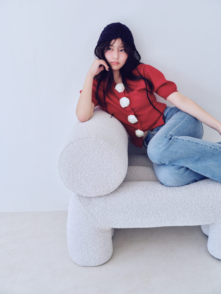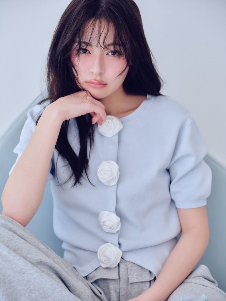 フロントにあしらった大きなサテンローズが印象的な存在感のあるカーディガン。スナップボタン仕様で着脱しやすく、前を開けたラフな着こなしもおすすめです。自然なブラウジングが叶う、トレンド感のあるシルエットも魅力。程よく肉感のあるニット素材を使用し、立体的なモチーフがより美しく映える素材感に仕上げました。
