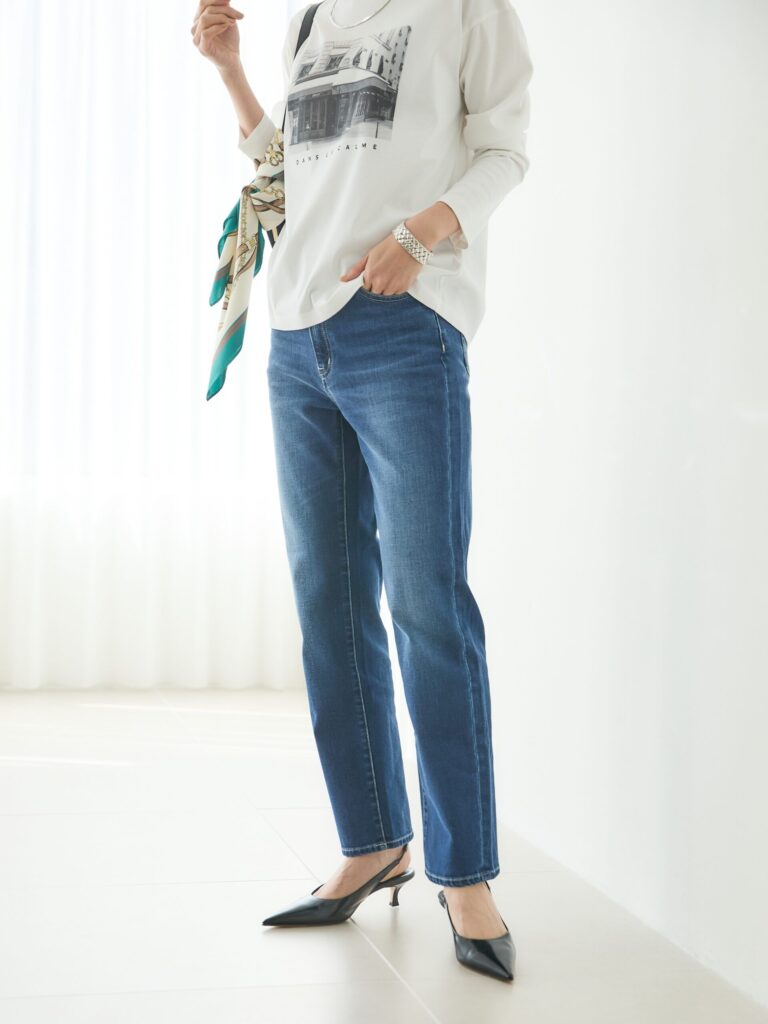 ナチュラルな美脚に見せてくれるデニムです。細身すぎず、シュッとした足元を実現するテーパードシルエット。