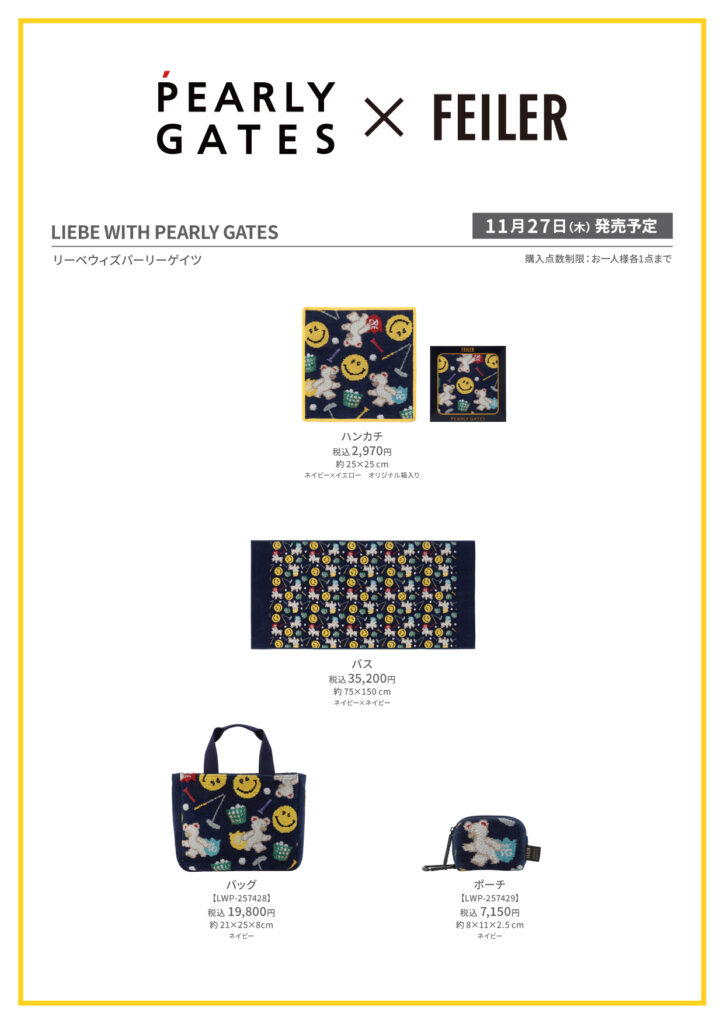 フェイラーではフェイラー銀座本店、髙島屋大阪店フェイラーショップ、フェイラー天神地下街店にて発売、パーリーゲイツではパーリーゲイツ直営店舗および、パーリーゲイツ公式オンラインショップ【mix.tokyo】にて発売されます。今回のコラボレーションのために特別に制作されたオリジナルデザイン「リーベウィズパーリーゲイツ(LIEBE WITH PEARLY GATES)」。フェイラー公式キャラクターFEILER BearリーベくんがPGエンブレムを持ち、パーリーゲイツのアイコンである「PG ニコちゃん」とゴルフアイテムを散りばめた遊び心溢れるデザインとなっています。