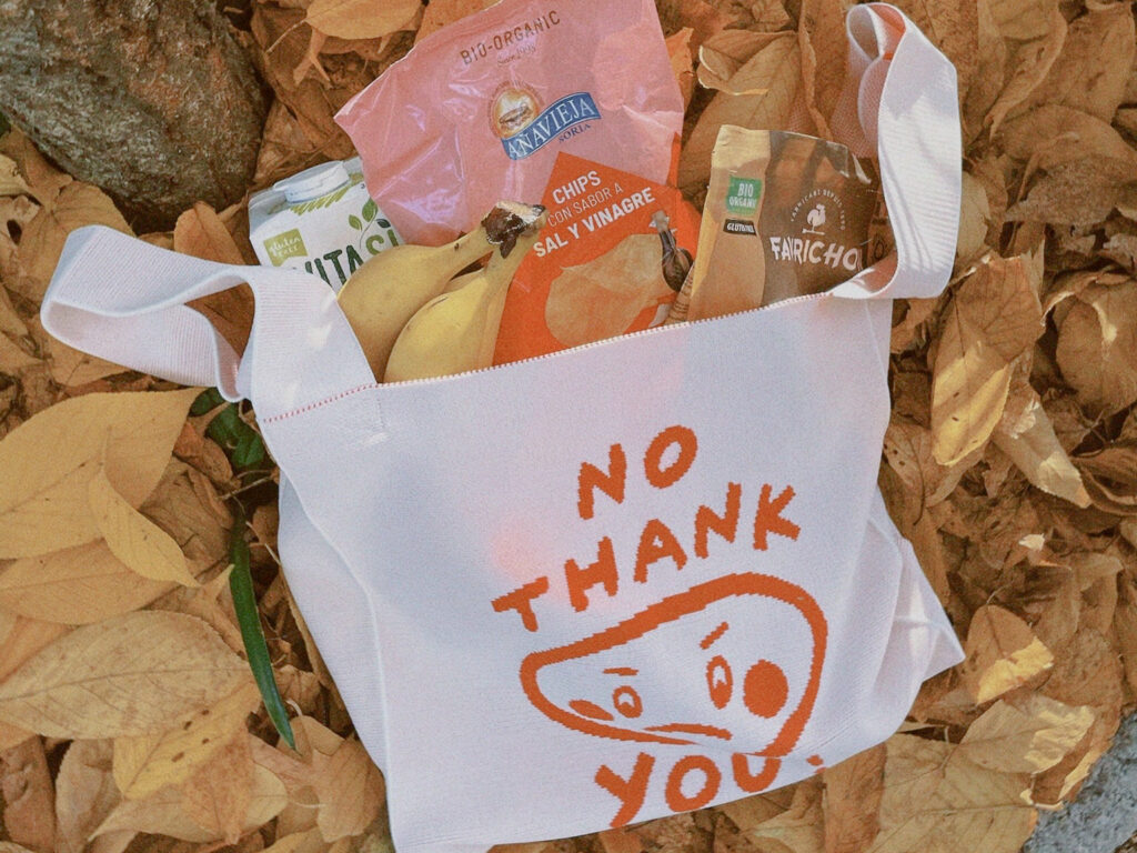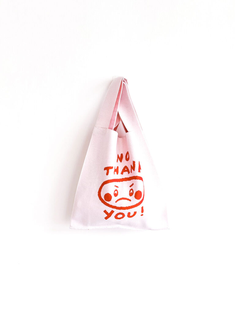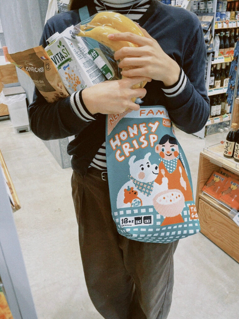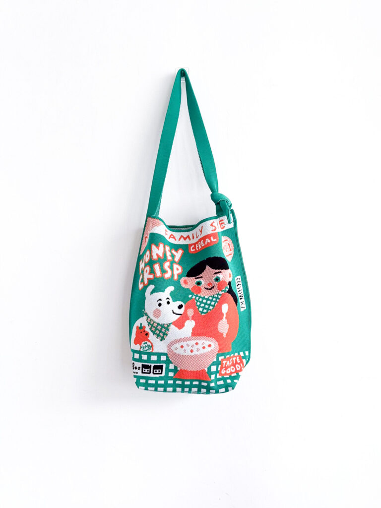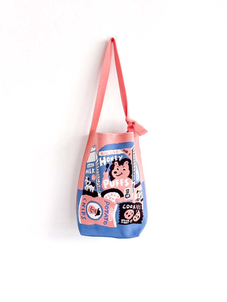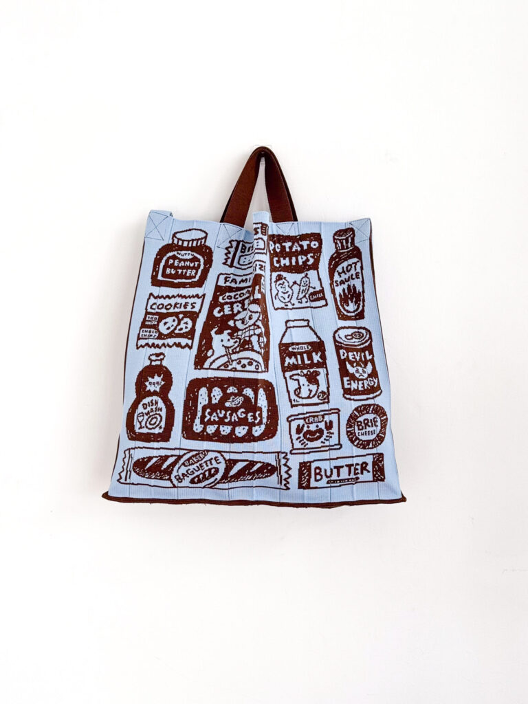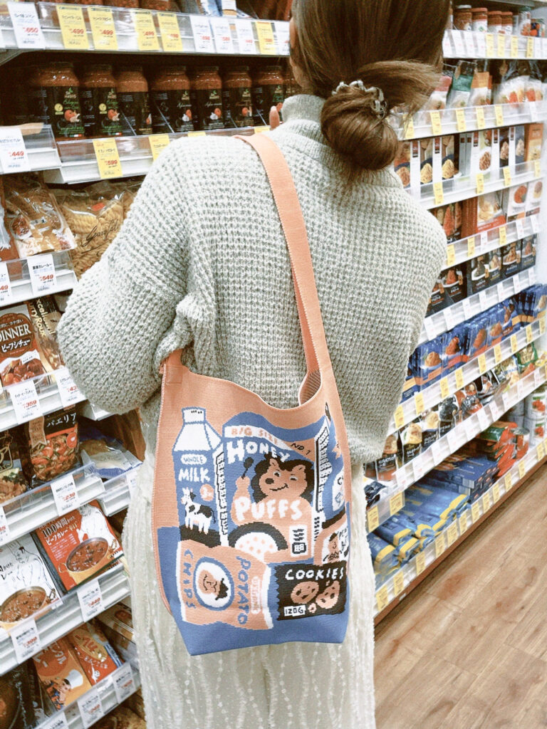 もう一種類のFourtyでは、サーモンピンクとブルーの配色が絶妙で可愛い配色。シリアルやミルク、ポテトチップス、クッキーなどのモチーフが並び、“スーパーマーケット”を思わせるポップで遊び心あふれるデザインに仕上がっています。編み地にはしっかりとした厚みがありながらも、軽量で柔らかい使い心地が魅力。コンパクトに折り畳んで持ち運べるほか、たっぷりしたマチによって自立する点もうれしいポイントです。