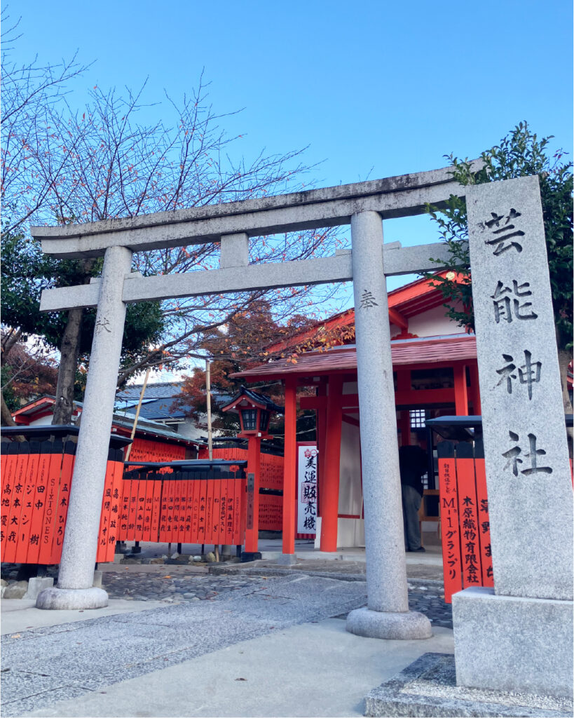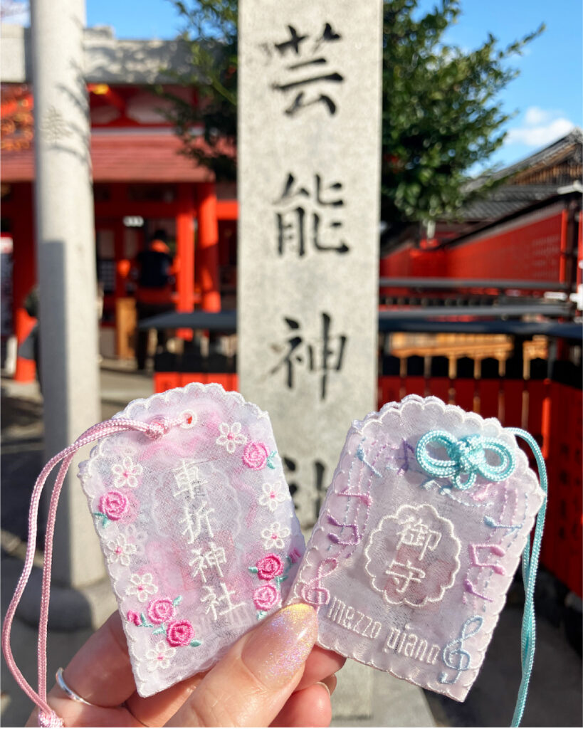 オンライン・店頭に並ぶ全てのお守りは、京都・嵐山の車折神社に運び、ご祈祷していただいています。京都・嵐山にある車折神社は、芸能・芸術・技芸の神様天宇売命(あめのうずめのみこと)を祀り、芸能神社には、多くの芸能人が訪れて玉垣を奉納しています。