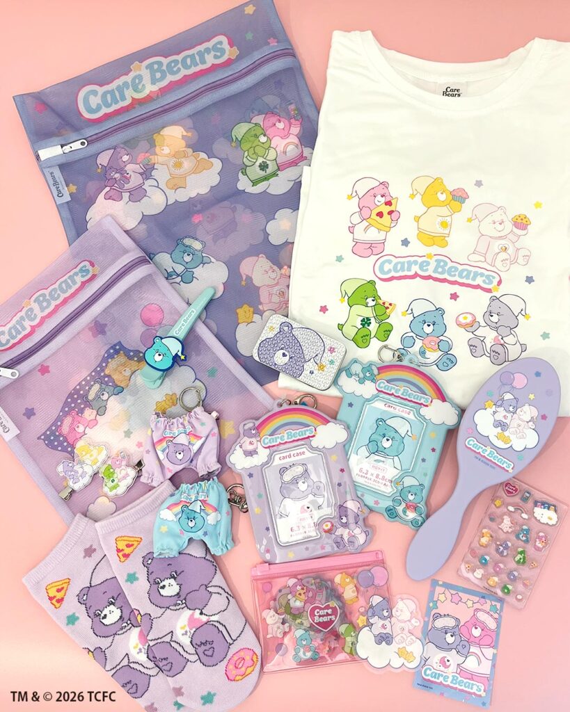 ケアベア™は、カラフルで愛らしい表情や、個性を象徴するシンボルバッジが魅力のキャラクターです。子どもから大人まで幅広い世代に親しまれており、近年は韓国を中心としたアジア圏の若い世代からも支持が高まっています。韓国の人気女性アイドルグループのMVにケアベア™グッズが登場したことでも注目を集めました。今回は、ケアベア™が”パジャマパーティー”を楽しむ様子を描いたアイテムが展開されます。