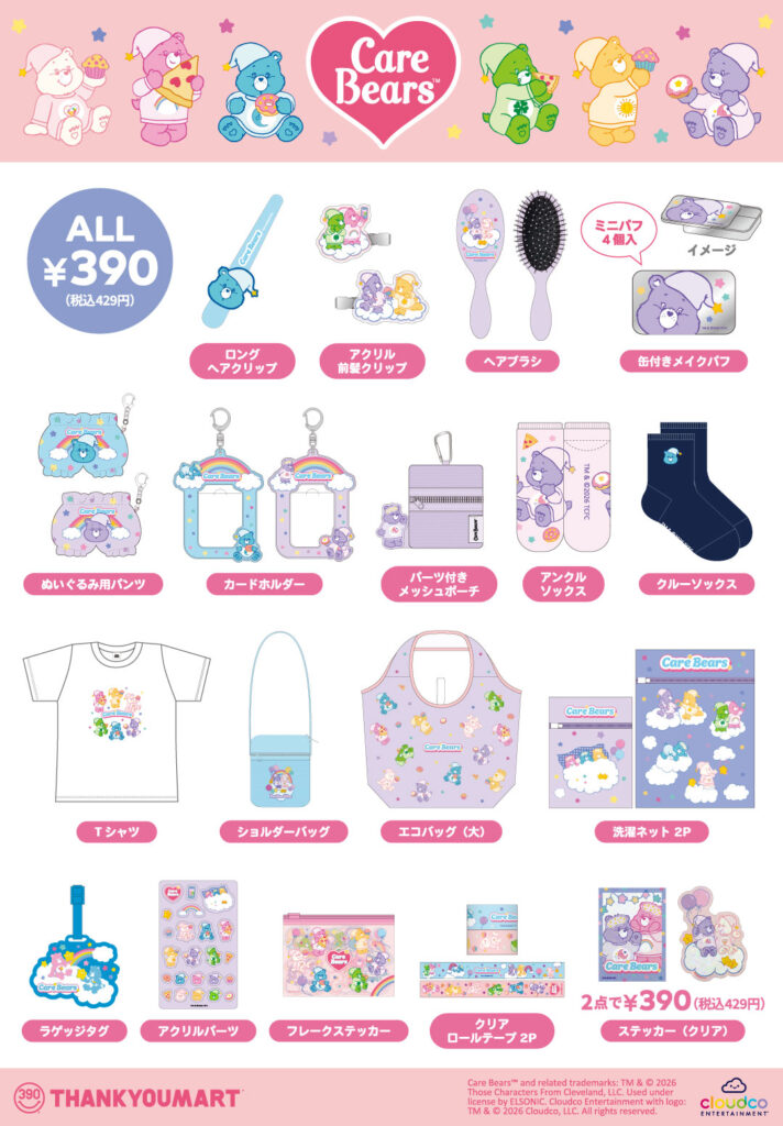 「Be Smile, Be Kawaii」をテーマに、キャラクターの限定アイテムを中心としたカワイイ推しグッズがいつ来てもALL390円で手に入るショップ「サンキューマート」は、世界各国で愛されるCare Bears™(Cloudco Entertainment)とのコラボレーション雑貨が、全国のサンキューマート店舗で1月下旬〜入荷次第販売が開始されます。また公式オンラインショップでは、1月7日(水)12時〜先行予約が開始されます。