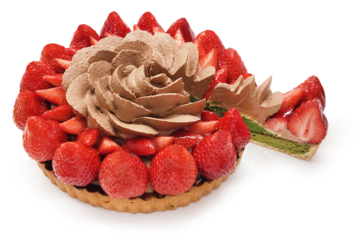 福岡県産の「あまおう」とチョコレートクリームをあわせて、八女抹茶のベイクドチーズケーキに飾り付けました。「あまおう」とほろ苦い八女抹茶の相性抜群なコンビネーションをお楽しみください。
