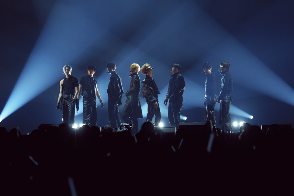 ALPHA DRIVE ONEがパフォーマンスの準備に入る間、スクリーンは廃墟に佇むメンバーを映し出す。青空の下で、荒廃したプールで、浜辺で、壊れた校舎のような場所で、傷つき何かを憂う8人。やがて彼らは海辺に集まり、太陽とも月ともつかない不思議な光を見上げて肩を寄せ合い笑い合った。そして舞台に再登場した8人は高速道路を背景に“FORMULA”をドロップ。重厚なビートに、足元から身体へ駆け上がっていくエネルギーが目に見える。2曲目は彼らのデビューシングル“FREAK ALARM”だ。鍛え上げた肉体からしなやかなで妖艶なステップを繰り出すJUNSEO、細身な手足をムチのようにしならせ色気をしたたらせるARNO、甘やかで透き通った雰囲気から空気を蹴り飛ばす強さまでを自在に操るLEO、長身を活かした力強い身体表現とテノールの声質が麗しいGEONWOO、爽やかな笑顔の中に艶やかさをにじませて奔放に踊るSANGWON、ハスキーな低音ヴォイスに肉感的なダンスで存在感を示すXINLONG、甘い顔立ちで甘い歌声を響かせ軽快な足さばきを見せるANXIN、笑顔を輝かせながら爽快なパフォーマンスで魅了するSANGHYEON。8人8通りの個性が、ALPHA DRIVE ONEを形作っていく。パフォーマンスを終え、“FORMULA”について、JUNSEOは「僕たちの勢いと闘志を込めたエレクトロニックポップです。ぼくたちだけのエネルギーを激しいビートに乗せて表現しました。ヘルメットのシールドを下ろす振付で、本格的な疾走に入る前の準備を表現しています」。“FREAK ALARM”はLEO曰く「僕たちが自分自身との激しい戦いの中で前に進み続ける、世界に向けて鳴らす最初のアラームのような曲です。大きく広がるアラーム音を振付のポイントにしています」だという。