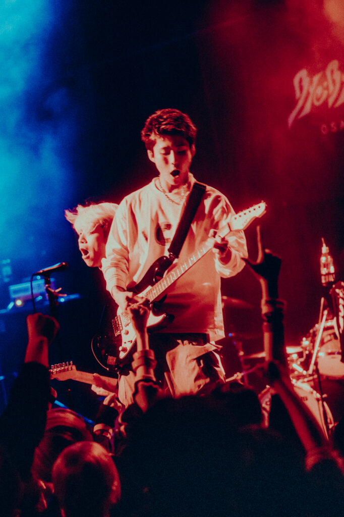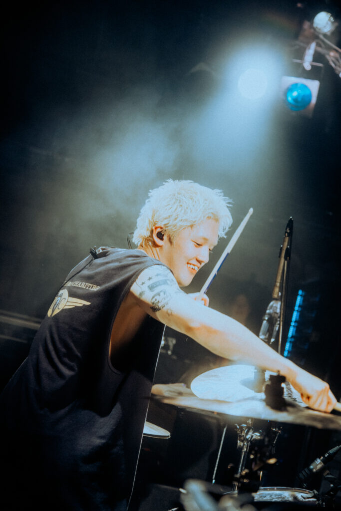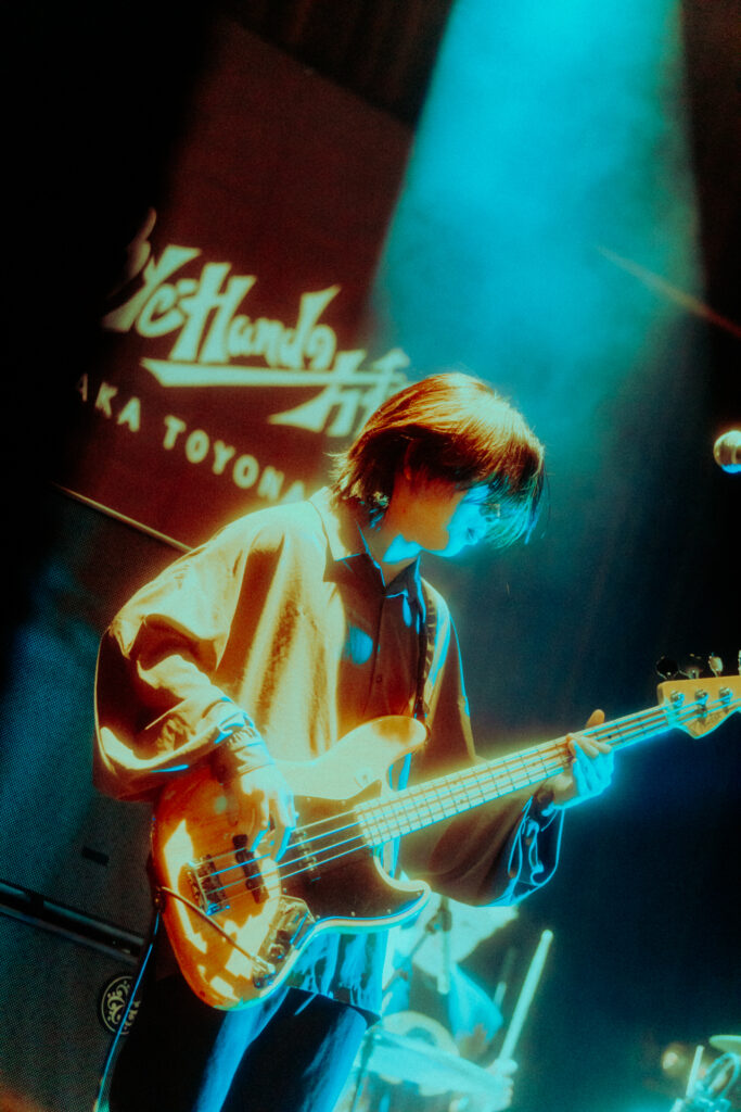 次の曲“夢夏”は、ツアーが始まった夏ごろに作ったナンバーだ。手のひらにプリズムの煌めきが落ちる中、生ぬるい夏の空気がアイスのようにとろけていく。“romance tower”に続き、「ここにいる全員にチャンスが訪れますように」と“春のチャンス”へ。“ジュウブンノサン”では早鐘を打つ心音に合わせて汐田が胸を叩き、ベースとギターの絡み合いの中にドラムが駆ける。曲間のMCでは、ツアーを振り返る4人。岐阜タンメンを発起として汐田の怒りが爆発し、メンバーを泣かせてしまったエピソードや、心斎橋でのライブの打ち上げの際、酔ったammoのメンバーに唐突な暴言を吐かれたエピソードが語られて、会場は笑いに包まれ、メンバーも満足げな表情を見せた。「だから舞台裏では(ammoと)バッチバチですよ。ケンカします。絶対負けません。育ちの違いを見せつけてやる!」物騒なMCと共に、ハードロックの王道を行く“タヒ神サマ”がフロアに響き渡る。鋭利なサウンドに耳を穿たれ、アシッドなライトが目を焼く中、降り注ぐ華麗なギターソロ。“darling rolling”では汐田が手拍子と歌声を煽り、“ひかりあうものたち”の冒頭はスポットライトが星の形を作る。