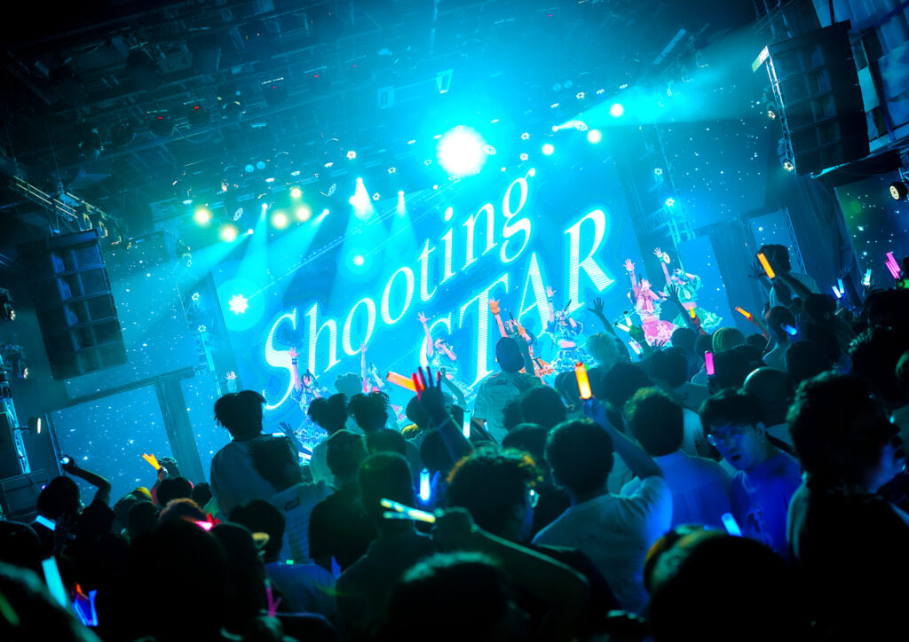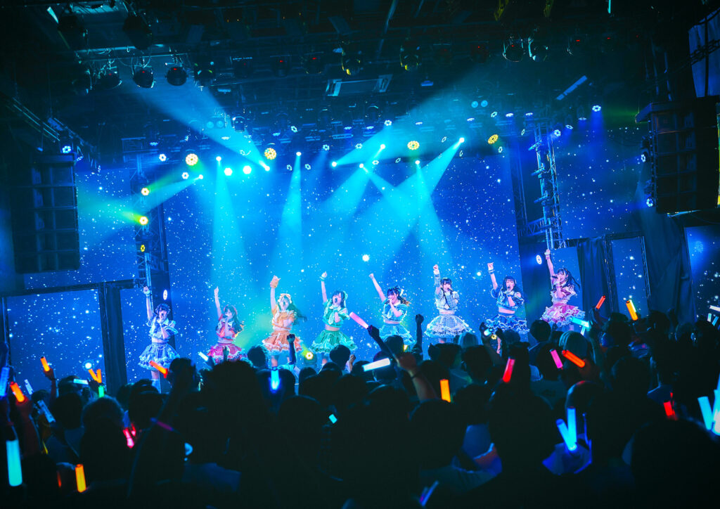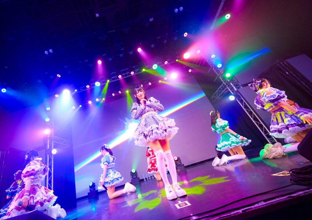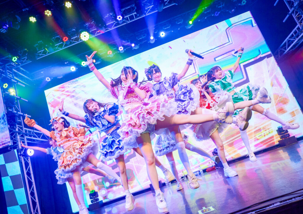 大歓声の中、真っ青な海を背景に玉響せつなが歌い出すのは“夏のキミにテヘヘのへ”。打ち上がる花火に指先でハートを描き、この夏がchuLaの色に染まっていく。そのまま“Kisskiss”、“ケ・セラ・セラ”、“涙色星”へと続いていくライブに、フロアの熱は高まるばかりだ。chuLaのパフォーマンスは細やかなところに個性が出る。優雅に体重を感じさせない玉響せつな、細かなリズムと歩調を合わせて表情を輝かせるはまちひよ、長い脚で器用にスカートをひらめかせる明鏡みらの、高い身体能力で跳躍する陽咲みお、すらりとしたスタイルを振付に活かす紫藤らら、丁寧な足さばきでジャンプの時にも気を配る綿森ろわ、柔らかな足取りと指先で人を惹きつける八木ほるん、爪先から頭のてっぺんまで全身で振付けを見せる飴色りんご。アルト、メゾソプラノ、ソプラノの3つの音域と様々な声音を使い分け、全ての楽曲が音楽としても輝いていく。ここで、chuLaは「今日お誕生日のひと~?」と聞きつつ、「こんな機会無いから、でっかい声で『みんなお誕生日おめでとー!』」と叫んで、新曲“chuLa流キミ誕祭”を発表。有名な“ハッピーバースデートゥーユー”のメロディから始まる新曲は曲調が転々として、全てのひとの誕生日と人生を祝福する楽曲となっていた。途中にはバースデーケーキを連想させる振付もあり、8色のロウソクが揺れて燃える。