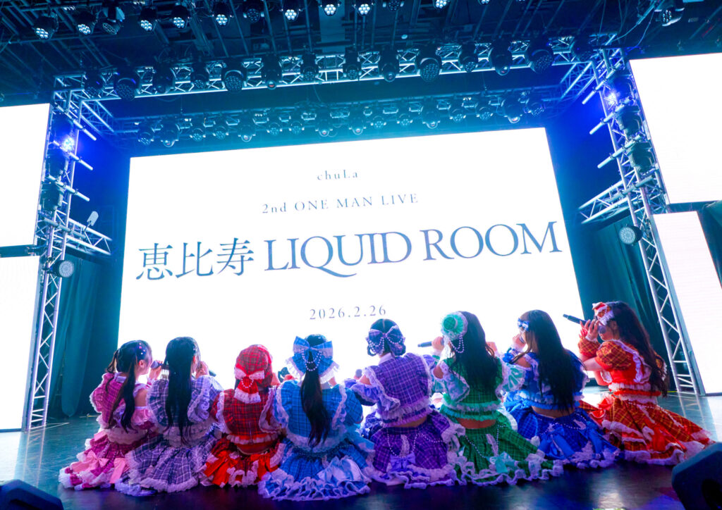 刹那の感動をカウントが割き、“FIGHTING DREAMER”が壮大に幕を開ける。スクリーンに映るのは曇り空、その向こうに輝く太陽へ向かって指を突き上げ、飛翔する8人の歌声。雨模様が映し出されれば、ペンライトの閃光がchuLaの横顔を照らす。やがて景色は朝焼けへと変わり、8人は歌声を振り絞ってライブの幕を下ろした。深く深く頭を下げ、感謝の言葉を語って緊張を解く8人。それから写真撮影を楽しむファンと彼女たちの和やかな一幕に、突然「重大発表」の文字がスクリーンに映る。まず発表されたのは、新曲“chuLa流キミ誕祭”の配信リリース情報。そしてchuLaがプロアイスホッケーチーム・東京ワイルズのアンバサダーに決定し、開幕戦でステージを行うことも明かされた。さらに、2ndワンマンライブが2026年2月26日(木)に恵比寿・LIQUIDROOMで開催されることも決定。メンバーは「感動で涙が出そう」と語りつつ、もう一度ステージに並び、手を繋いで深々と頭を下げて、感謝の言葉を繰り返しながらステージを去って行った。満員の白金高輪SELENE b2を前に、武道館をも感じさせるパフォーマンスと歌声とで熱狂を誘ったchuLa。彼女たちは一歩一歩、新しいステージへと足を進めていく。