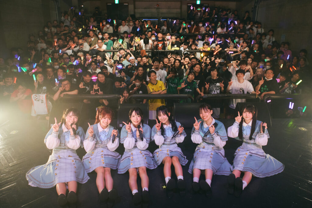 楽曲はさらに加速度を増していく。眩しい日射しが降り注ぐ世界へ連れだすように、6人は煌めいた笑顔を浮かべて“可能性パレード”を歌い踊った。心踊らせるパレードに誘われたフロア中の人たちが、6人に熱い声をぶつけながら、可憐でチャーミングな乙女たちへ夢中になっていた。さぁ一緒に声を上げてともにシンガロングしながら、素敵な未来へと繋がるパレードに笑顔で参加しよう。ライブはNON STOPで続いていく。好きという気持ちの高ぶりを「君に会いたいんだって願ってる」と、彼女たちは感情のアクセルを力強く踏み込むように歌いだした。君に会いたい気持ちをぶつけた“角を曲がれば、君がいる”だ。この曲でも観客たち一人ひとりが、ときに6人で思いを一つに重ねて伝える恋の告白に胸を熱くしながら、喉が割けるほどの声を彼女たちにぶつけた。好きすぎて苦しい胸の内だからこそ、君(メンバー)に向けて高まるこの気持ちをぶつけずにはいられない。しかもこの曲が、この場に夏景色を連れ出す合図にもなっていた。スペイシーでシンフォニックなイントロが流れ出したとたん、場内中から熱い口上が飛び交いだす。“Dear My Sunshine”でも彼女たちは躍動するパワフルなダンスビートに乗せて、「明日もまたよろしくね」と歌いながら、この場にいる人たちを、眩しい夏の季節へ連れ出した。気持ちを灼熱の夏気分に染め上げて6人と一緒に過ごすこのひとときが、胸をジリジリと熱く焦がしていく。「これからもよろしくね」と彼女たちに言葉を投げかけたくなる。この熱狂と楽しさがこのまま終わらないでいてほしい。6人はさらに灼熱の眩しい季節の中に“夏を走れ”を通して、満員の観客たちを連れだした。夏が訪れた時に感じるあの不思議なドキドキが、6人の歌声の陽差しを全身に浴びるたびに大きく高鳴る。だから、彼女たちが歌う「走れ走れ走れ走れ」の歌声に合わせて、高まる気持ちを胸に、共に水平線に沈む太陽に向かって駆け続けたい。そんな風に彼女たちがライブの場を通してドラマを作ってくれたのが嬉しい。まさに「君と一緒なら火傷しても構わない」という歌詞の一節のような気分だ。「速く速く」や、「走れ走れ」と歌う声を全身で受け止めるたびに、身体中が熱く火照りだすのを抑えられない。