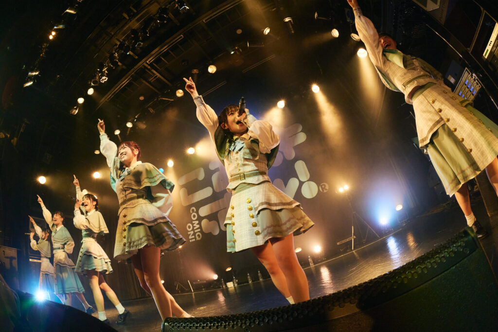 その楽しさをさらにカラフルに色付けるように届けたのが“POP”。6人は歌声の色を巧みに塗りかえながら、ポップでダンサブルな楽曲に乗せて観客たちの感情を熱く騒がせ、夢中にしていく。だから、彼女たちに向けて熱い声をぶつけずに、歌に合わせて、その場で飛び跳ねずにいられなかった。止まることなく“NEO WORLD ORDER”へ。曲を重ねるごとに沸き立った感情のBPMがどんどんと速度を増していく、まさにそんな気分だ。だから、アタックの強いビートに合わせて身体を揺らせば、熱い声をぶつけずにいられなかった。サビ歌で彼女たちと一緒に同じ振りを真似しながら、隙を見ては熱いMIXをぶつける。これこそがライブでこそ自分らしく生きていると強く実感する瞬間だ。だから、6人と一緒に思いきり高く腕を突き上げ、魂を熱くしていた。ライブもいよいよクライマックスへ。“プラチナ AGE”のイントロが流れたとたん、フロア中から絶叫したMIXが飛び出した。身体中から楽しいオーラを発散させて歌い躍るメンバーたち。その姿に向けて打ち放った、熱を抱いたMIXの声、声、声。気づいたら、フロアのあちらこちらにマサイしていく(ぴょんぴょんと真上に高く飛び跳ねる)人たちが生まれていた。この楽しさはもう止められない。最後にこみっきゅおん!が届けたのは、アルバムのリード曲であり、未来のこみっきゅおん!の姿を示唆した、20代の青春の蹉跌を詰め込んだ“aim for”。6人の歌声に合わせて「Oh!Oh!Oh!」とシンガロングするたびに、曇っていたこの世界の視野がクリアになり、勇気を胸に、彼女たちと一緒に輝く未来へ立ち向かえる自分になれる。「さぁ行こう」と前を向いて歌う声を旗印に、みんなで「Oh!Oh!Oh!」と叫びながら、心を奮い立たせて一緒に突き進みたい。そんな風に一人ひとりを勇者にしてくれる歌なのが嬉しい。「一人じゃないから 僕が手を繋ぐよ」という言葉を信じ、挫けそうな弱い気持ちを振り切って、未来に向かって一緒に駆けだしたい。
