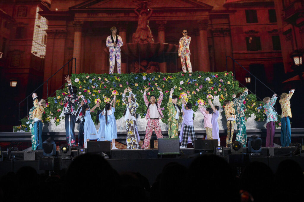 ステージに衣装替えを終えたEXILE THE SECONDが現れ、“YEAH‼︎ YEAH‼︎ YEAH‼︎”へ。膨大なペンライトが躍動したファンキーなパーティータイムを創出。メンバーがバーテンダーやウェイトレス、囚人、警察官、そしてマジシャンに扮して盛り上げた“SUPER FLY”は最後、神谷が美女に姿を変えた木村をお姫様抱っこした。SHOKICHIの口上から本日のサポートアーティストであるNEO EXILE2組のパフォーマンスへ。KID PHENOMENONは“Mirror”、LIL LEAGUEは“15分”でオーディエンスに鮮烈な印象を与えた。LIL LEAGUEの岩城星那が「引き続きNEO EXILEの応援よろしくお願いします!」と口にし、全員でお辞儀をしてEXILEファンにアピールした。EXILEの歴史を辿る映像を皮切りに、“Each Other’s Way ~旅の途中~”から始まるEXILEメドレーへ。花をあしらったカラフルな衣装に着替えたEXILEの面々。ソファーや花といった小道具を巧みに登場させながら、“Flower Song”、“Lovers Again”、“ふたつの唇”、“Ti Amo”、“響 ~HIBIKI~”という珠玉のバラードを軸にしたメドレーで自らの歴史を振り返った。ATSUSHIが「この曲は2007年にリリースされ、あれから18年の月日が経ちました。皆さんこの曲とともに素敵な思い出をたくさん作っていただき、何よりこの曲を育てていただき本当にありがとうございます」と言った。「みんなで歌ってみませんか?」と呼び掛け、オーディエンスと共に“道”を歌った後、ATSUSHIがオーディエンスだけの“道”をリクエスト。4万人の歌声が響き渡った。特大のシンガロングを幸せそうな表情で聞き入っていたATSUSHI。「あふれだしたみんなへの愛が止まらない」と歌い、愛をオーディエンスに返した。