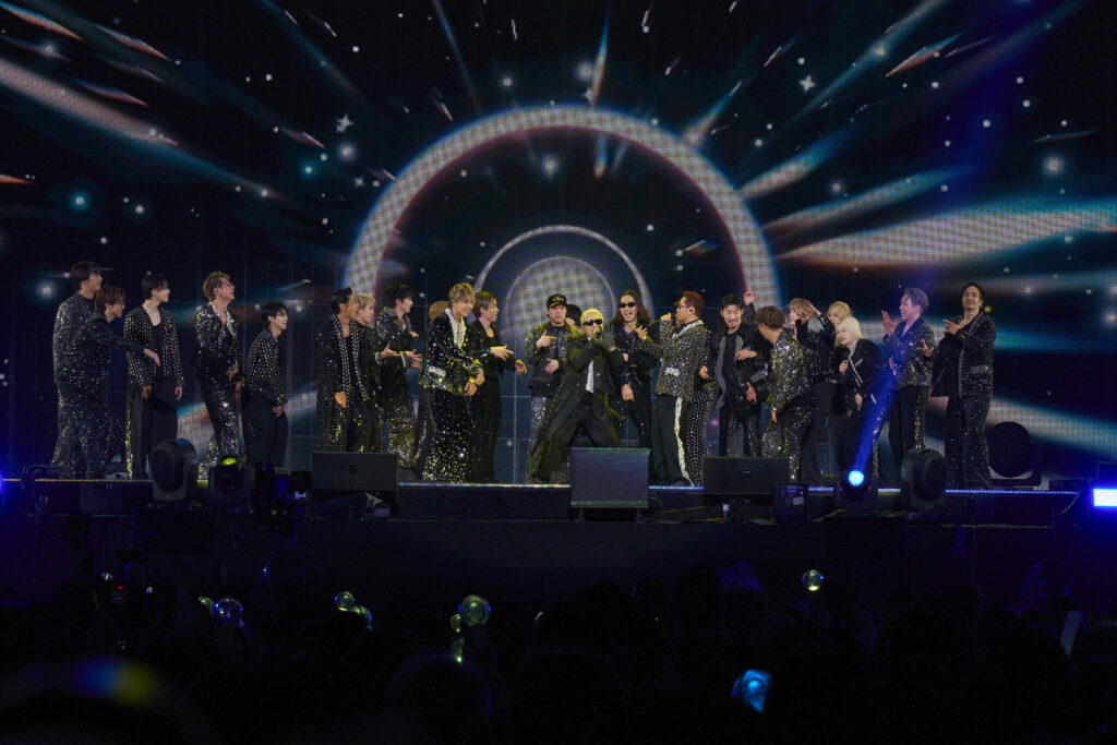 静謐なピアノの調べが響き、ATSUSHIによる美空ひばりの“愛燦燦”のカバーへ。奥行のある伸びやかな歌でドームを掌握した。歌のEXILEに続いては、ダンスのEXILEだ。EXILEが誇るパフォーマーにMATSU、ÜSA、MAKIDAIも参加。全員がアグレッシブでスキルフルなダンスでオーディエンスの度肝を抜いた。LEDビジョンにはATSUSHIがEXILEに本格復帰し、4年5カ月ぶりのシングルとしてリリースされた“Get-go!”のMVが映った。TAKAHIROがリムジンから降りてきたATSUSHIを迎え入れ、ハグするシーンが映り、ステージ上のATSUSHIが「後半戦、盛り上がっていきましょう!」と言って再会の曲“Get-go!”から後半戦をスタートさせた。TAKAHIROが「まだまだ盛り上がっていく元気はありますか!?」と言って、“VICTORY”へ。2番でメンバーがフロートに乗り込んだ。“Someday -House Mix-”、“BOW & ARROWS”と続け、祝祭感を増大させていく。SHOKICHIが音頭を取る形で「E!X!I!L!E!」のコールで盛り上がった。 客席にカラフルなバルーンがいくつも舞い、自らのルーツでもあり、リスペクトを贈るバブルガム・ブラザーズの“WON’T BE LONG”のカバー、キュートな振りがドーム中で見られた“Ki・mi・ni・mu・chu”に続いて、本編ラストは“銀河鉄道999”だ。躍動するビートに合わせて花道でジャンプするメンバー。m-floのVERBALが現れ、完全体による“銀河鉄道999”を4万人に届けた。