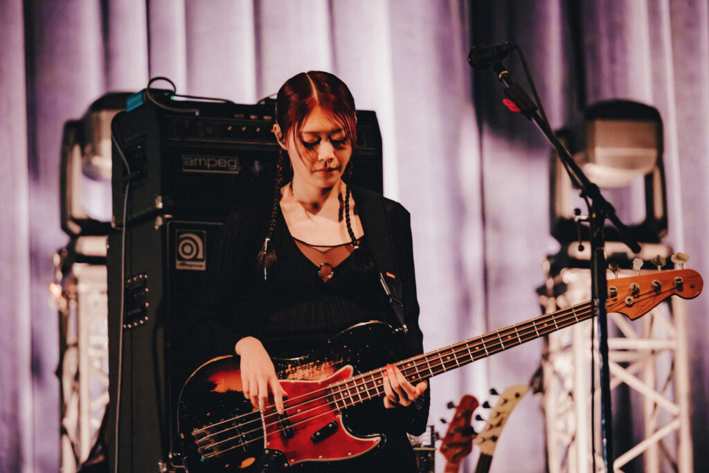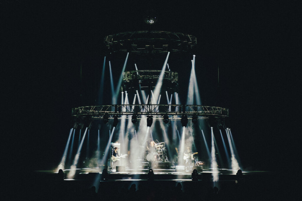 はにかんで曲を終えると、天井から円形のライトが降りてくる。会場を乱舞するライトが彩った“OOPARTS”に、光がステージの上で編み上げられて羊文学を閉じ込めた“mother”。対照的な演出の2曲を過ぎれば、光の中にミラーボールが降下する。そこから散らばる光は、“夜を越えて”でスクリーンの中のメンバーを花吹雪に包んだ。紫色のスモークが湧き上がる中、再び上昇していく舞台装置に、ステージへと降り注ぐ光の雨。“Burning”の激しいドラムの中、モエカの鋭い瞳は観客を睨め上げる。4カウントで再び降下する舞台装置に、赤い煙が燃え上がる“more than words”では、イントロの瞬間に歓声が沸き上がった。伸びやかに解き放たれるヴォーカルは、高い天井を突き抜けるほど。一転してポップな“mild days”で、モエカとゆりかはコーラスを重ね、オーディエンスは身体を揺らしてそのハーモニーに身を任せる。