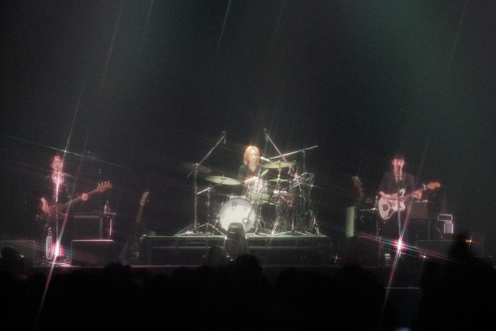 あまりにポジティブすぎるその反応に、モエカとゆりかは吹き出す。「みんな今日はありがとう!」そうしてラストナンバーには、「みんなの明日からの良い日を祈って」と、“光るとき”が選ばれた。物憂げな希望と優しい寂しさとを美しい語彙で紡ぎ上げ、スリーピースのストイックなサウンドになめらかな歌声をのせる、羊文学の真骨頂。プリズムの煌めきと、光線が作る無数の連なりが花となって躍る中、バンドは明日へ、未来へと羽ばたく。輝きと轟音の中、飛び跳ねて最後のコードをかき消した羊文学。緊張から解き放たれたメンバーたちは、笑顔で手を振り、おどけあって、ステージを去っていった。目前に迫る欧州ツアーへ、そしてその先へ。羊文学の「いま、ここ」は、いつまでも続いていく。