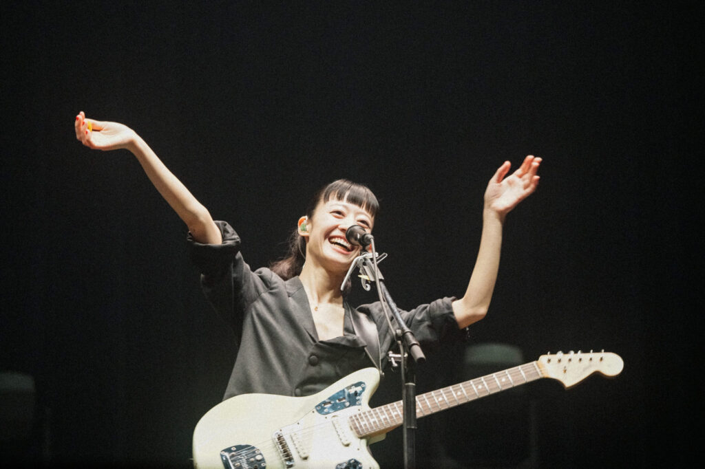 曲ごとにイメージカラーがふられ、美しいライティングも印象的だったこの舞台。シャープなリフに誘われて、張りが良いベースの音色が下腹に響く“電波の街”、巧みなカメラワークが切り取“Addiction”に、スリーピースバンドのさまざまな表情を見せていく“いとおしい日々”。水底に沈んだようなライトが揺らめく“つづく”では、落下するコーラスと浮遊する歌声とが絡む。あどけないギターソロに始まって、泡沫のコーラスがはじけ飛ぶ“マヨイガ”の、強い祈りが込もったサビは、今この瞬間を愛し、歌声を浴びながら生きている観客の身体に浸み込んでいく。8曲目の“声”を終えて、モエカは「みんな、今日は来てくれてありがとう」と笑顔。そのまま曲の合間に輝く色とりどりのライトを眺め、「本当に武道館、キレイです」と讃える。「10月8日にリリースしたニューアルバム、聴きました?」との問いには拍手と歓声が応えるも、「まだちょっと聴いていない人がいるみたいですね~」なんて冗談を返したモエカ。次の曲は、ニューアルバム『D o n’ t L a u g h I t O f f』から“ランナー”だ。のんびりとしたMCとは対照的な、浮かび上がって疾走する、しかしグラマラスなヴォーカル。モエカの大きな瞳が観客を見回すと、そのまぶたのラメが輝く。