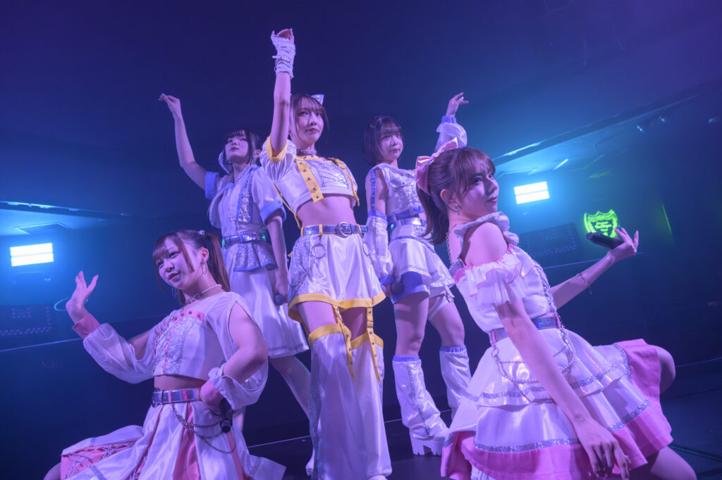 まだ熱気は冷めず「ここからはカバーパート、まだまだいくよー!」という多々良のDJに合わせて笹塚舞歌(大森)のカバーによる“PRESIOUS NIGHT”から始まり、電音部の他エリアの楽曲カバーへと突入。“レモン少女”、“オオキニ☆ぱーりーなぃと“、“Mirror Mirror”、“Shining Lights”と5曲を続けてパフォーマンスする。対バンでも見てきた他エリアユニットの曲たちでもあり、キュート・コミカル・エレクトロと、多彩なサウンドに寄り添ったパフォーマンスで魅了した。“REVOLUTION ANTHEM”から始まったライブ後半戦で、5人はふたたびMa’Scar’Pieceの熱さを知らしめる。“BON BON FIRE”ではフロアがサイリウムのオレンジ色で染まり、ファンからの「FIRE!」コールによりさらにフロアはヒートアップ。アッパーチューンな“ゼロ・グラビティ”もしなやかなダンスと笑顔でのパフォーマンスを貫いた。期待が高まる中で“TOKYO”からラストスパートに突入。東京の夜を感じさせる壮大なテクノサウンドの中、再びメンバーとファンとのコール・クラップで一体感が高まると、“圧倒的アイドルの極み”へ。煽りがキャッチーなこの曲でフロアと一緒のジャンプもまじえ、ツアーを締めくくった。