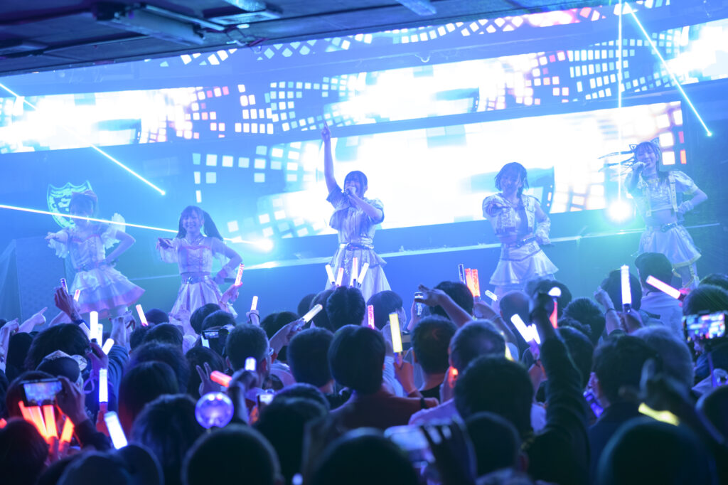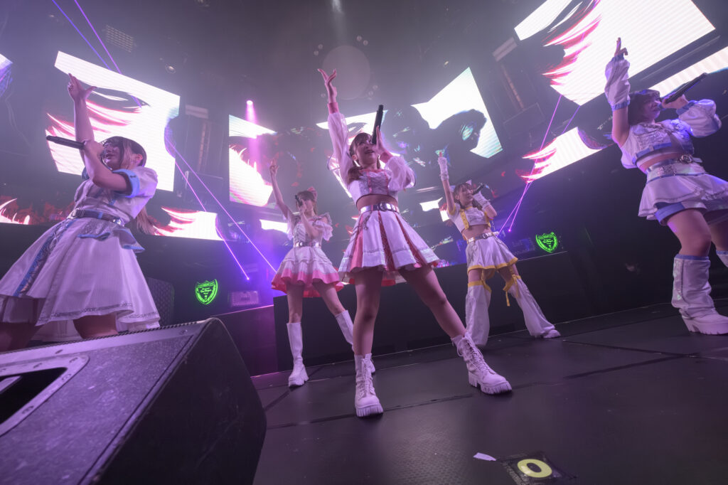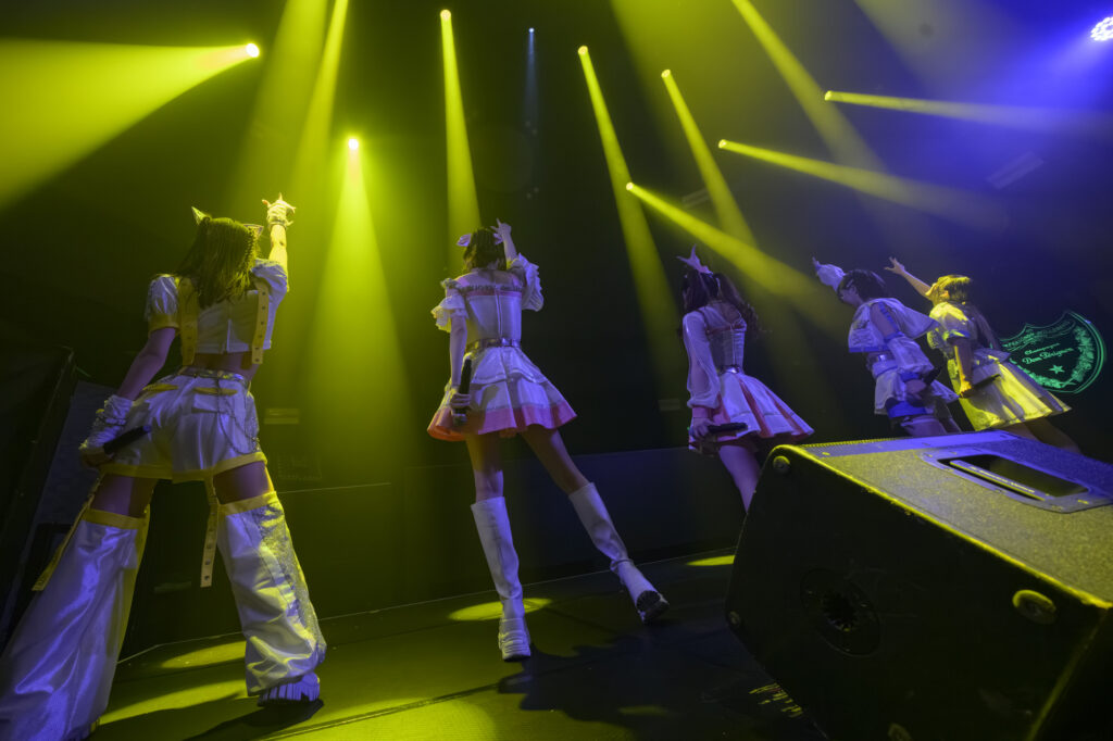 Overtureがかかって、今度は5人全員によるライブ本編に突入する。1曲目から1月23日(金)に配信されたばかりの新曲“Hallucination”で、Ma’Scar’Pieceらしいクールな熱気で空間が染まっていく。トランスサウンドからの突然の転調、カッコよさの中にコケティッシュさも混じったダンスと、Ma’Scar’Piec eの魅力が凝縮された1曲だ。続く“ALASKA”でも一糸乱れぬパフォーマンスを見せ、幻想的なライブ空間を作り上げた。“Into a trance”、“Supernova”とリスナーを陶酔させる楽曲が続き、クラップや“Supernova”での「viva la revolution!」の掛け合いで、メンバーとファンの思いが共鳴していった。MCは東京にちなんだメンバーの挨拶の後、咲間が「まさか1曲目に新曲をやるとは思わなかったでしょ?」とうれしさを語り、山本が「葛藤や幻想の中で、私たちだけのアイデンティティを求めた、探求の曲です」と込めた思いを伝える。そしてライブに戻ると“Ma’Scar’Piece”が披露され、キャラクターごとの自己紹介パートでの掛け合いもフロアの一体感を高める。かと思えば“爆裂タウマゼイン”で疾走感たっぷりの和トランスにのってパワフルに踊り、その勢いのまま“熱電爆散”へ突入し、フロアのボルテージを引っ張り続けた。