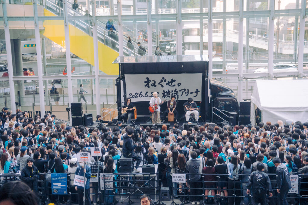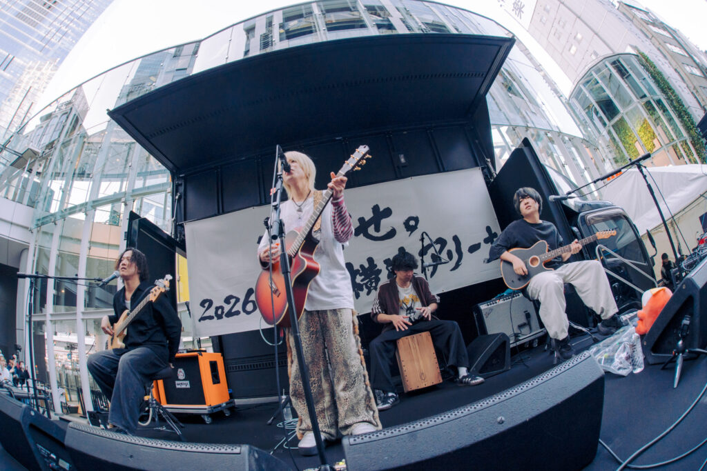 朝まで降り続いた雨も上がり、春の強い風が吹く、からりと晴れた渋谷の夕空。ビルやたくさんの広告看板、高架を走る自動車が見下ろす川沿いに、「ねぐせ。2026.6.28 横浜アリーナ」の幕を掲げたステージトラックと、鮮やかなスカイブルーのタオルやシャツを纏った群衆が開演を待っている。4月16日(木)、ねぐせ。のゲリラフリーライブが東京・渋谷ストリーム前の稲荷橋広場で行われた。施設の階段に腰掛けて、うちわを振る人の姿も多い。時間となり、ひときわ強い風が吹く中、幕をくぐって登場したねぐせ。のメンバーたちは、それぞれの楽器を手にする。なお今回は、自身初のアコースティック編成だ。なおと(Dr)が軽快にカホンを鳴らす中、りょたち(Vo&Gt)はオーディエンスを見回しギターを担ぐ。「名古屋のねぐせ。、渋谷フリーライブです。よろしく。歌って踊ろうぜ!」その言葉と共に、ねぐせ。は“グッドな音楽を”でライブをスタート。「ワン、ツー!」のカウントと手拍子に導かれて、なおや(Gt)の爽やかなソロがビル風に吹かれて行く。「ホットでグッドな音楽を 歌い続けてみたらいい」の大合唱は、たくさんの人々の想いが行き交う都心の一等地、木曜のアフターファイブを迎えたビル街に響き渡る。