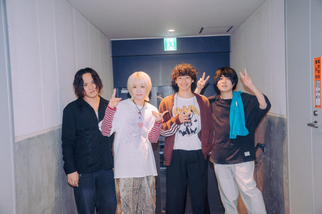ギターを降ろしたりょたちは、「元気やな渋谷!」と呟きつつ“一生僕ら恋をしよう”のタイトルをコールする。薄いオケがストリングスの厚みを加える中、コーラスの如く歌ってヴォーカルに寄り添うしょうと(Ba)のベース。それにきらめきを乗せるカホンとギター。そっと手を重ね合わせ、りょたちは澄んだ歌声でファンを抱きしめる。「恋」という言葉で「愛」を歌い、優しい時間が過ぎていく。そのまま今度はギターをかき鳴らし、スキップするカホンのリズムに乗せて、どこか物憂げな“日常革命”へ。過ぎ去っていった日常の些細な幸福をソフトなメロディに乗せた失恋ソングは、少しずつ黄昏ていく空気に溶け込んで、沈黙の中に都会の雑音が混ざれば、それは映画のような景色と化す。泡めいて弾けていくギターソロはベースと絡み、最後のコードは柔らかく消えた。「先日出した最新曲、春の曲をやらせてください。“青春バイブレーション”」続けてねぐせ。は、この4月にリリースされたばかりの新曲“青春バイブレーション”をドロップ。カホンの細やかな刻みに乗せてベースは踊り、始まりの季節に「グッドバイブレーション」の合唱が駆け抜けていく。