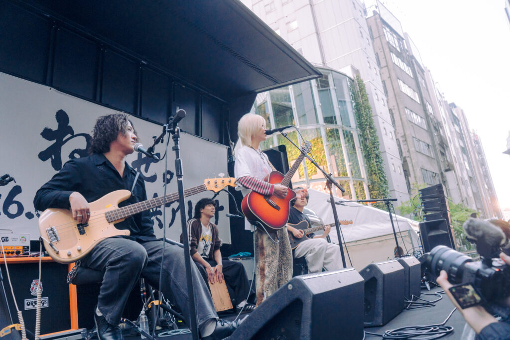 「ありがとう!」4曲を終えて、カホンを叩くなおとは「普段は18個くらい叩くものがあるんですけど、今日は1個だけ」と観客を笑わせる。今回はフリーライブということで、観客の中には偶然通りかかったファンもいるはずだ。バンドが問いかけると、なんと最前列に「たまたま通りかかって観に来た」という人がいた。これにはメンバーもファンも驚いた。そしてこのフリーライブは、6月28日(日)に神奈川・横浜アリーナでライブが行われることをきっかけに企画されたものだ。宣伝にあわせて、りょたちは「過去イチ曲やります」と宣言するも、メンバーからは「500曲やります」「そんなに曲ありません」「空飛びます」「飛びません」「潜ります」「潜りません、ウソつかないでください」とボケ&ツッコミの応酬が飛び交う。ひと通り喋った後、「曲やる?」の台詞と共に、バンドは“愛してみてよ減るもんじゃないし”を披露。ゆっくり手を振るオーディエンスに降り注ぐベースと、シャララと軽やかなギターやカホン。歌い終えると、りょたちは「路上ライブは気持ちいいね。外だから歌うのが気持ちいいです」と感慨深げに空を見上げた。