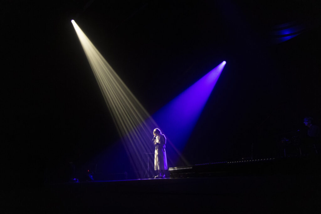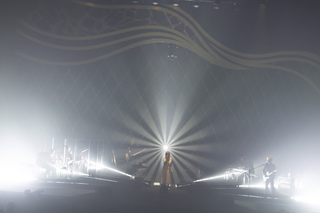 ステージは、不揃いな感情を優しく切り取った“かたっぽの靴下”へ。続けて穏やかな空気を切り裂くように始まった“End of Days”では、ReoNaがマイクを握る手に力を込めて言葉を紡いでいた。ふと時が止まる。心音が聞こえるほどの静寂のなか、ReoNaがゆっくりと語りだしたのは「最悪の選択肢を選んでしまうくらいなら、いっそのこと、逃げたっていいと思うんです。」というメッセージ。ボカロP傘村トータから託された曲“敗走”で輪郭のある歌声を震わせた。そしてReoNaがふと「ウィー・アー・オール・アローン。」と呟くと、たった一人のあなたに寄り添う歌として“芥”を客席へ届けた。彼女の透き通るブレスが会場に溢れるたび、夢の中にいるような感覚を覚えた。