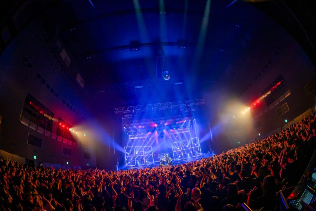 そこへ、前半は白いシャツ姿だったマオが黒いジャケットをまとって再登場して合流すると、“delete”がスタート。煽り文句もメンバーの動きもどんどん衝動的に、激しくなっていく。「盛り上がってんな、まだ行けんだろ?行きたいんだろお前ら?」とマオが焚きつけて歌い出したのは“ほうき星”。ファンも大きな声でシンガロングする。カラフルな照明、ミラーボールも輝く中で“V.I.P”を披露。マオはShinjiへと歩み寄り肩に手を置いたかと思えば、後方の階段を上ってゆうやの隣へ。その後は明希の肩を抱きながら歌唱した。マオがジャケットを脱いで両腕を露わにし、“dummy”がスタートすると、鋭いシャウトを交えながら獰猛にパフォーマンス。チカチカと明滅するストロボライトが盛り上がりを加熱させていく。明希が「Zepp Haneda!俺の想いが全然伝わってねえんだよ。やれるか?!やれるか?!」と煽り、「Oi Oi Oi Oi」とファンと互いに競い合うように激しくコール&レスポンス。明希は髪を振り乱してターンを繰り返しながらプレイして、Shinjiはしゃがんだかと思えば即座に立ち上がり、ギターを垂直に天に突き立て仰け反りながら演奏。荒々しいパフォーマンスをメンバーたちが繰り広げる中央で、ゆうやは緻密にプレイしていた。「まだ行けんだろ?お前ら『Dark side』の時はそんなもんじゃなかったもんな。お前らの本性を知ってるからな。俺を!俺様を!気持ち良くさせろ、いいか!」とマオが威嚇するように叫ぶと、“0.5秒の恋”へ。電飾の灯りは赤、白の十字架の形に彩られ、激しくブリンク。ファンは拳を振り上げ、メンバーは髪を振り乱して演奏に没入。間奏で明希はShinjiへと近付いていき、2人が向き合って音を刻む場面にも目を惹かれる。マオはお立ち台よりも前へ、ステージの際ギリギリの突端でシャウト。ゆうやのスティックは大きな美しい軌道を描き、激しくもタイトなドラミングでしっかりと土台を支えた。「行けんのかZepp?行けんのか東京?結婚しよう」という煽りからの“プロポーズ”で絶叫と轟音のカオスを生み出し、本編を締め括った。
