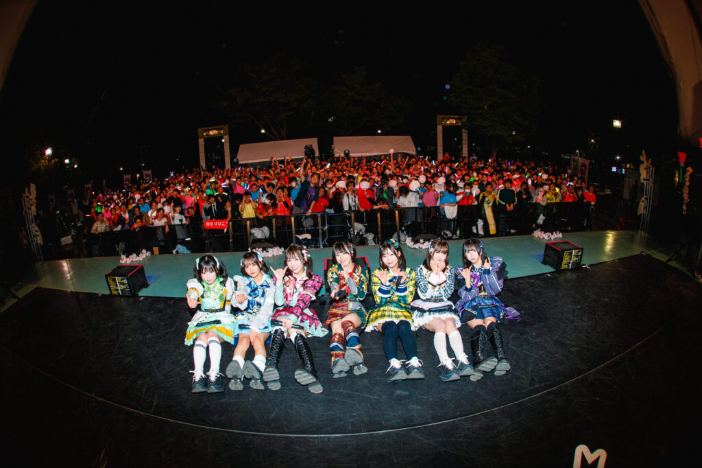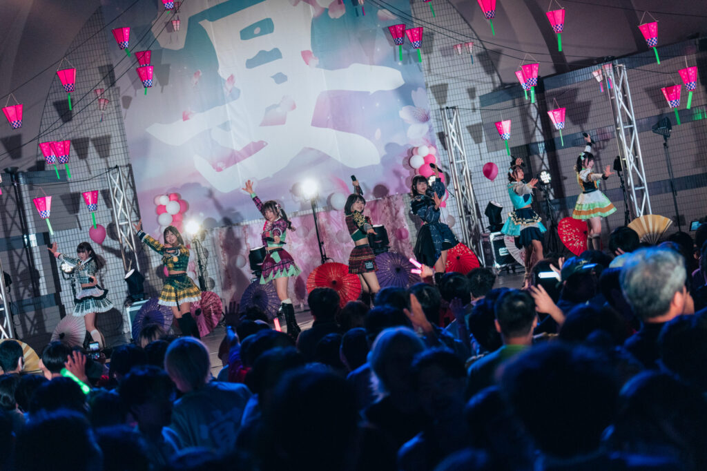メンバーカラーのペンライトと宴Tシャツによって会場が埋め尽くされた。新衣装がライブ前日に解禁された新ビジュアル衣装の初のライブだったため、ファンのみんなも大盛り上がりのスタートだった。“ハチャメチャUtaGe!ビ→ト”から“U.K.U”と続き、最初からフルスロットルで始まったライブも1つ目のMCが終わるタイミングでは、夕焼け空が広がっていた。MC明け一発目、野外、夕空、絶好の時間帯でのタイトルコール。“さよならトワイライト”。その瞬間、会場のボルテージは最高潮に。